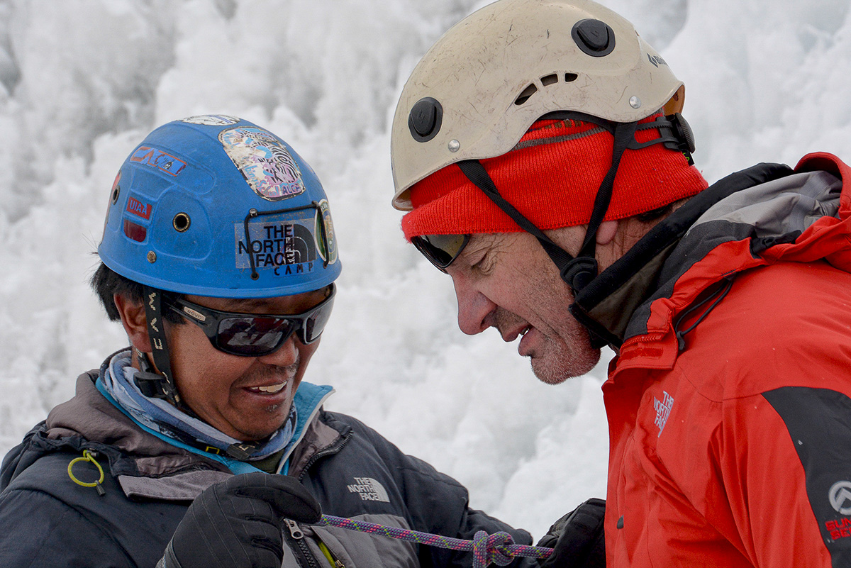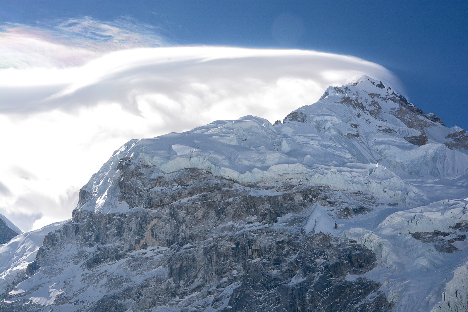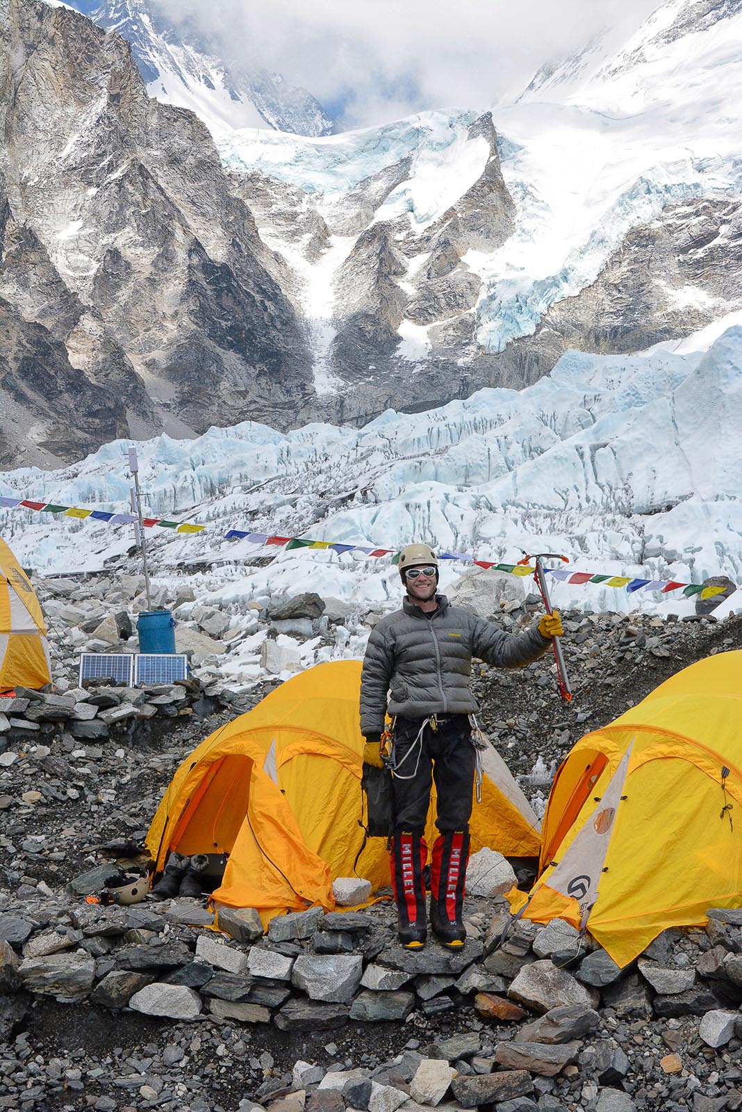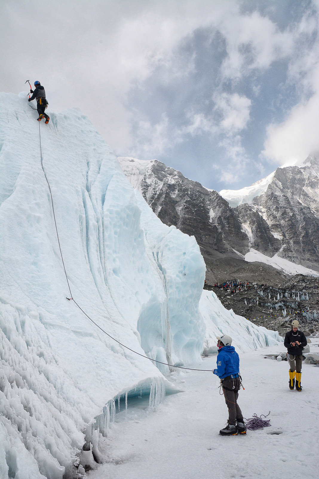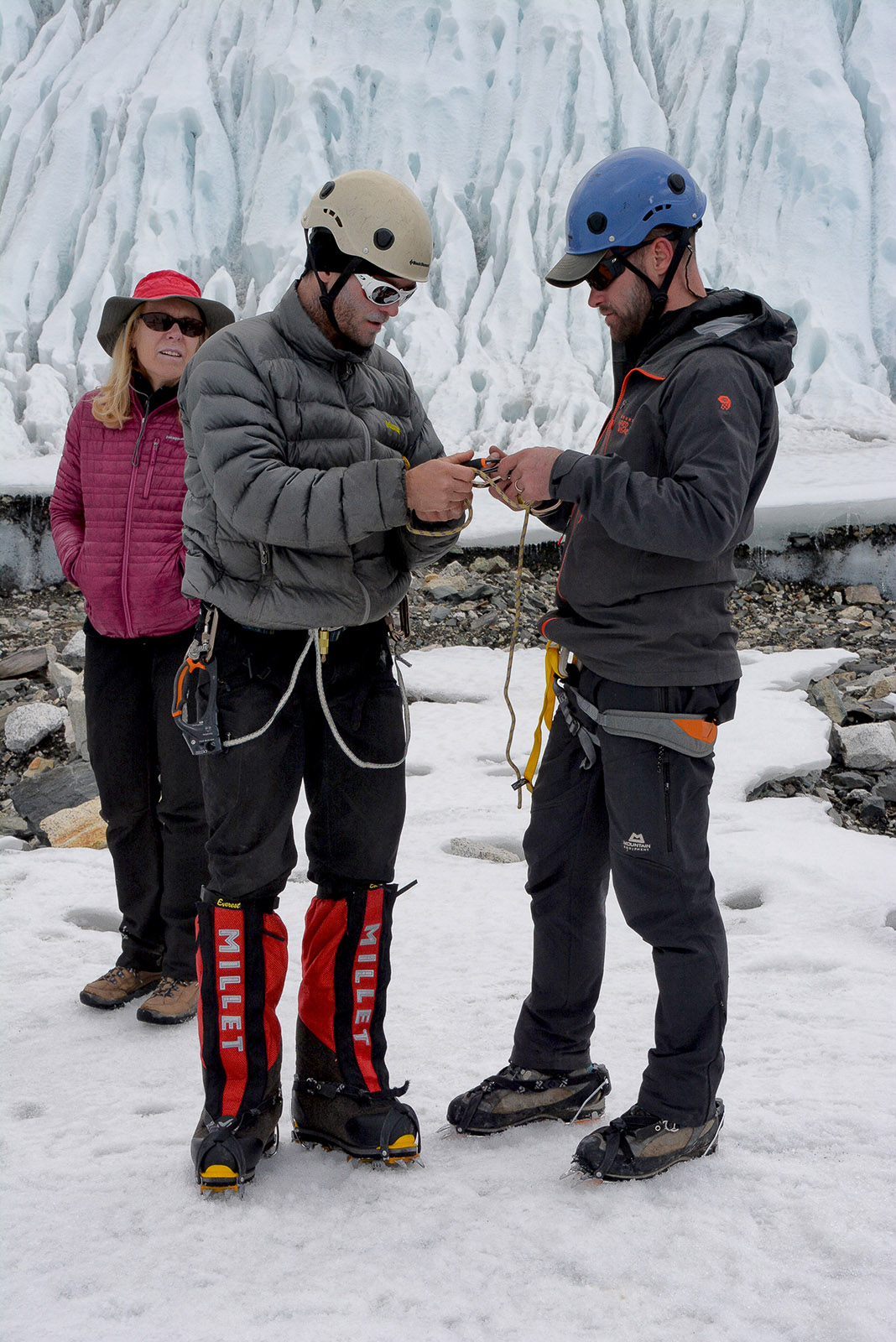Lunch was served at noon in our mess tent. Afterwards we all went with Panuru to watch Kevin, B-1, Brad and Ake practice ice climbing on the ice wall near our camp. With crampons ready and ice picks in hands each had their turn climbing the 40 foot ice wall as Bob and I watched. It started to snow so we returned to our tents before dinner to try and warm up. When the sun is out it is very warm here but once it is cloudy it gets very cold. At dinner we planned our descent down the mountain tomorrow to Lobuche and then Kevin, Brad, B-1 and Ake with Tashi will hike to Lobuche high base camp to spend the night getting ready to climb Mt Lobuche.