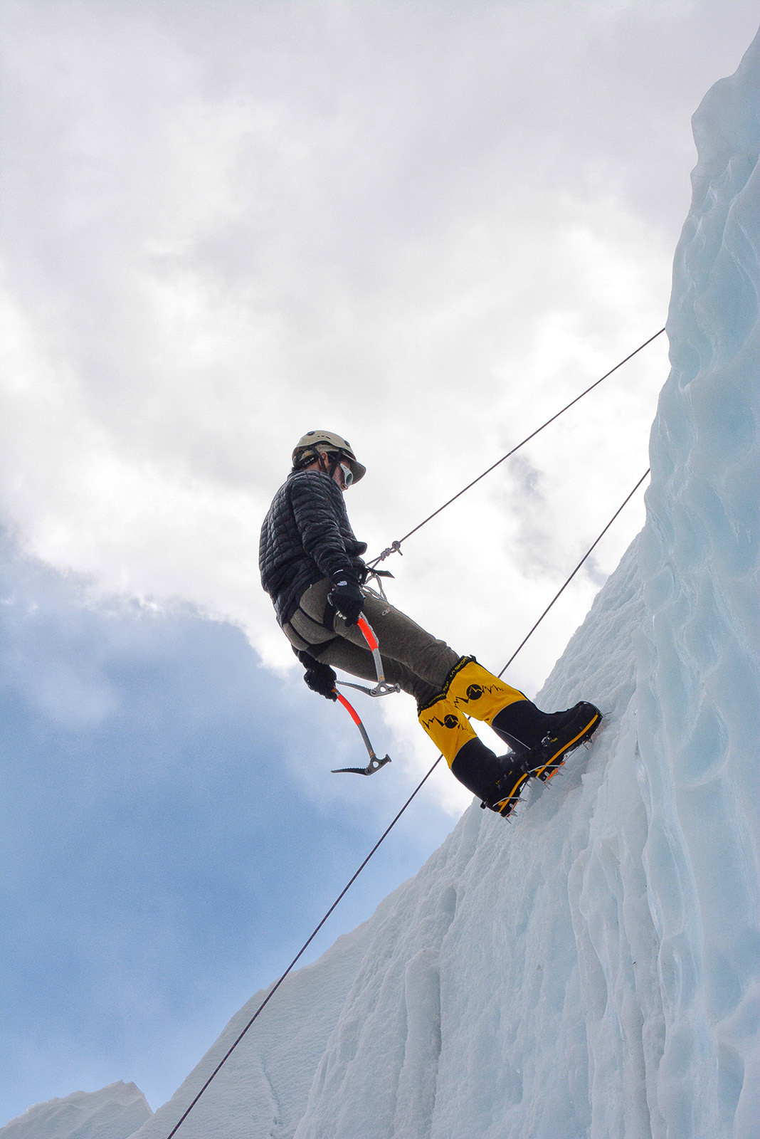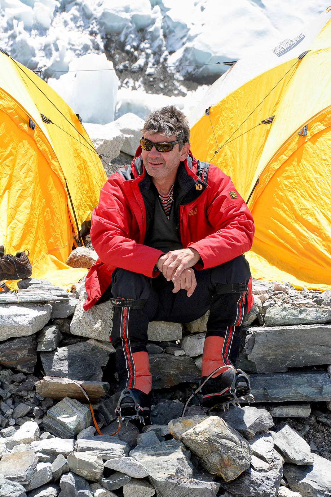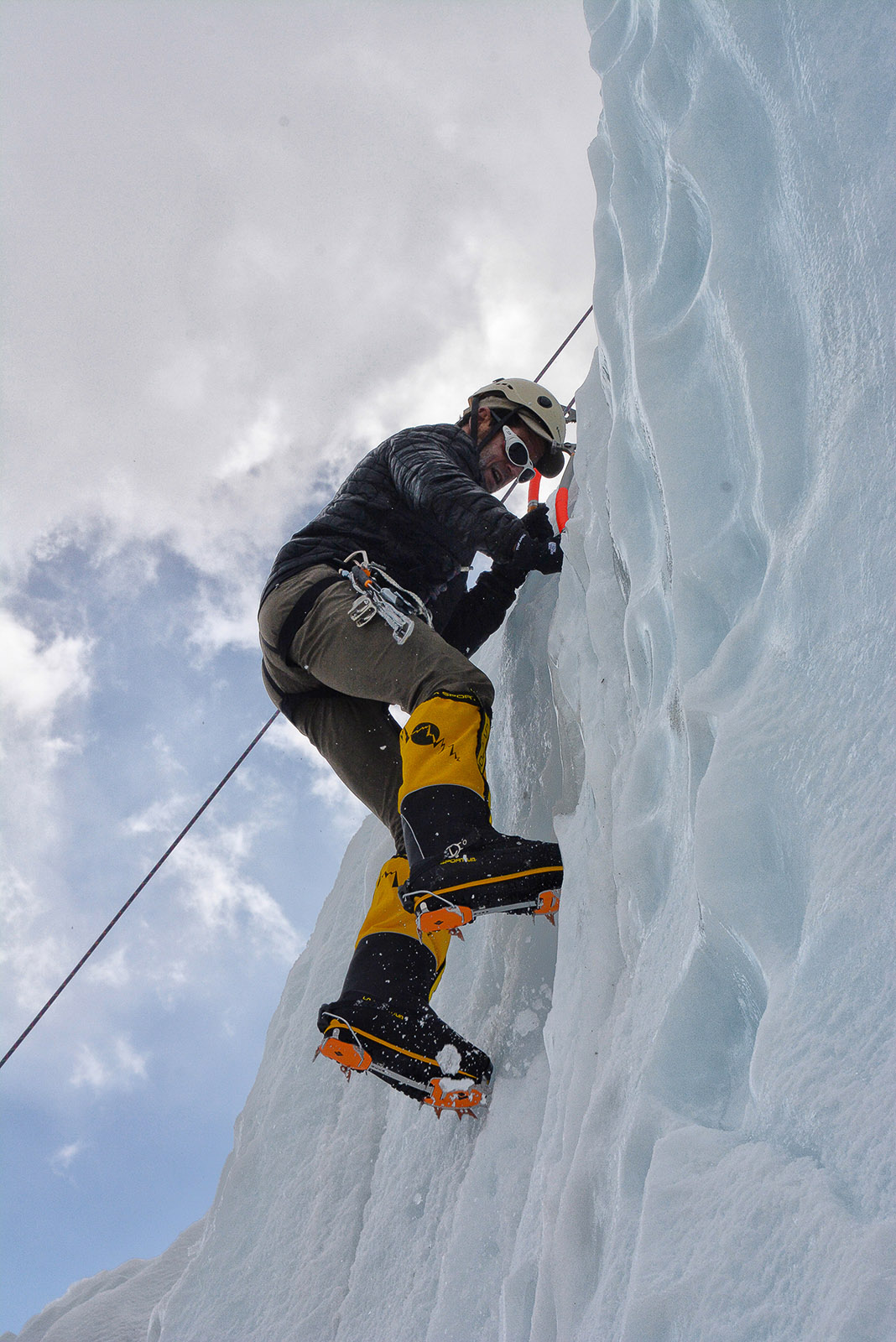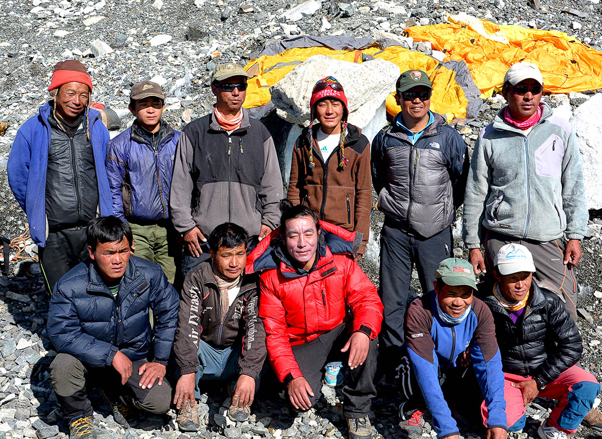 Lunch was served at noon in our mess tent. Afterwards we all went with Panuru to watch Kevin, B-1, Brad and Ake practice ice climbing on the ice wall near our camp. With crampons ready and ice picks in hands each had their turn climbing the 40 foot ice wall as Bob and I watched. It started to snow so we returned to our tents before dinner to try and warm up. When the sun is out it is very warm here but once it is cloudy it gets very cold. At dinner we planned our descent down the mountain tomorrow to Lobuche and then Kevin, Brad, B-1 and Ake with Tashi will hike to Lobuche high base camp to spend the night getting ready to climb Mt Lobuche.