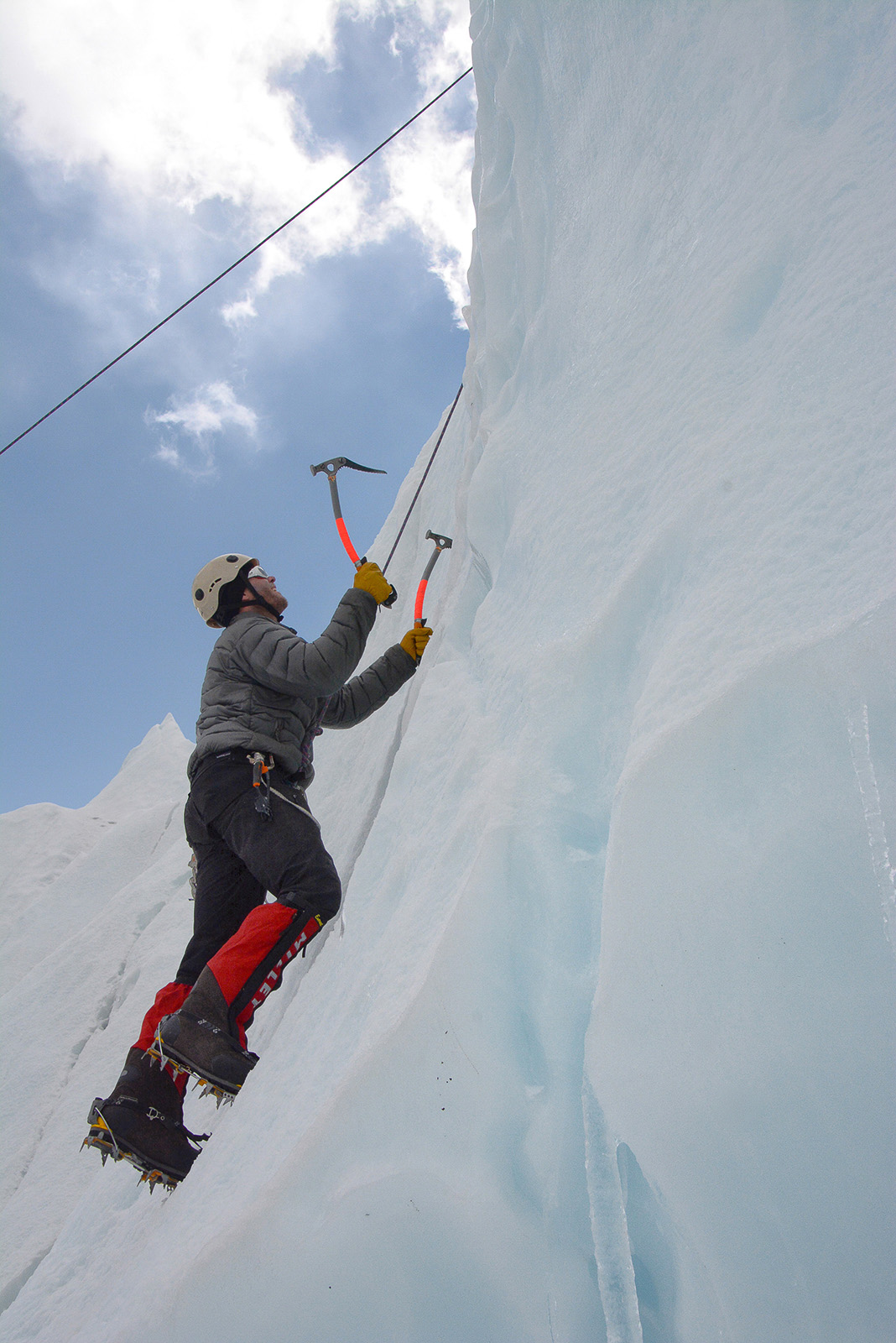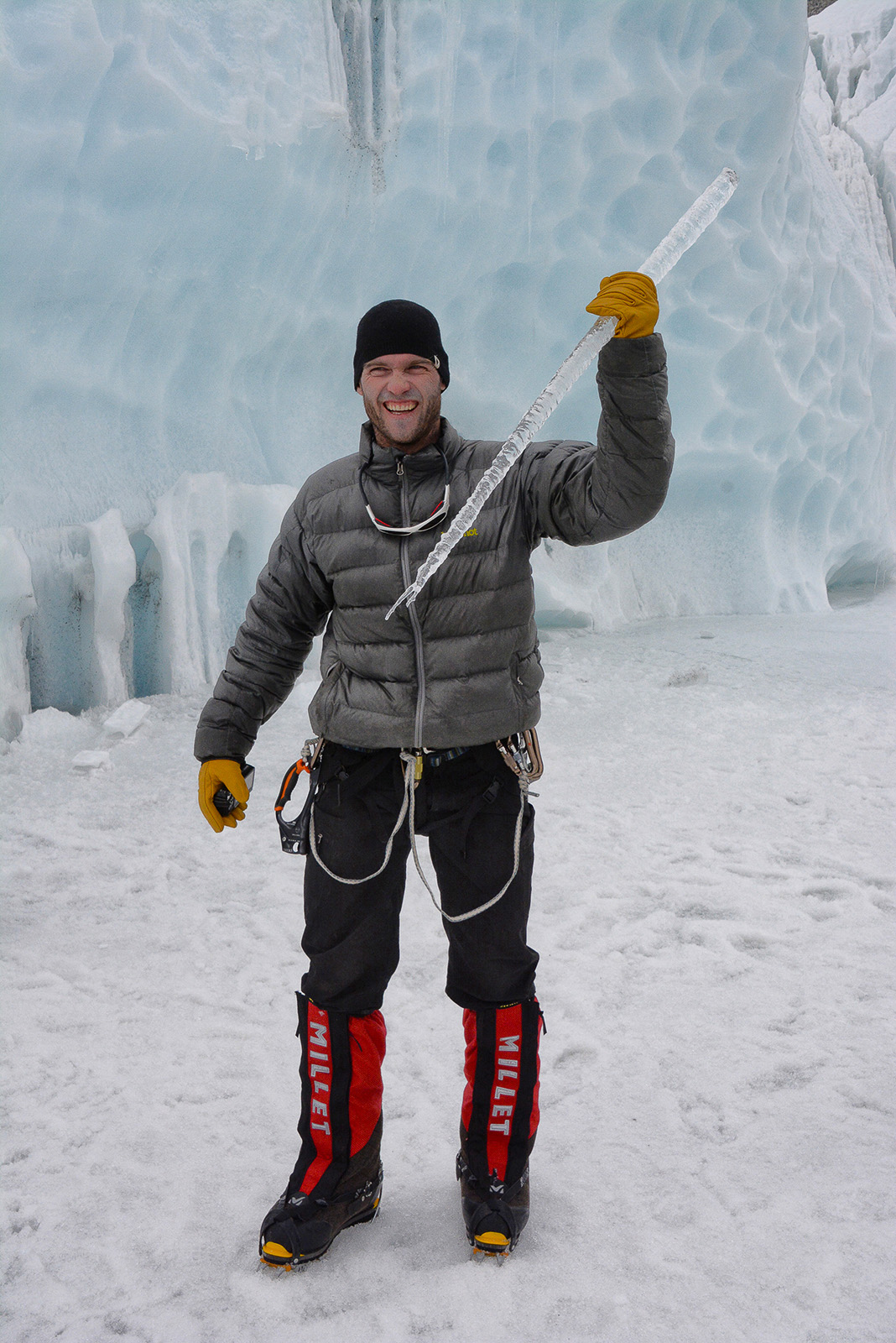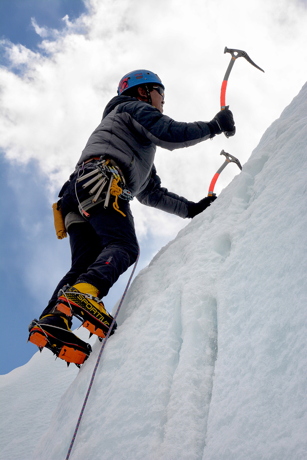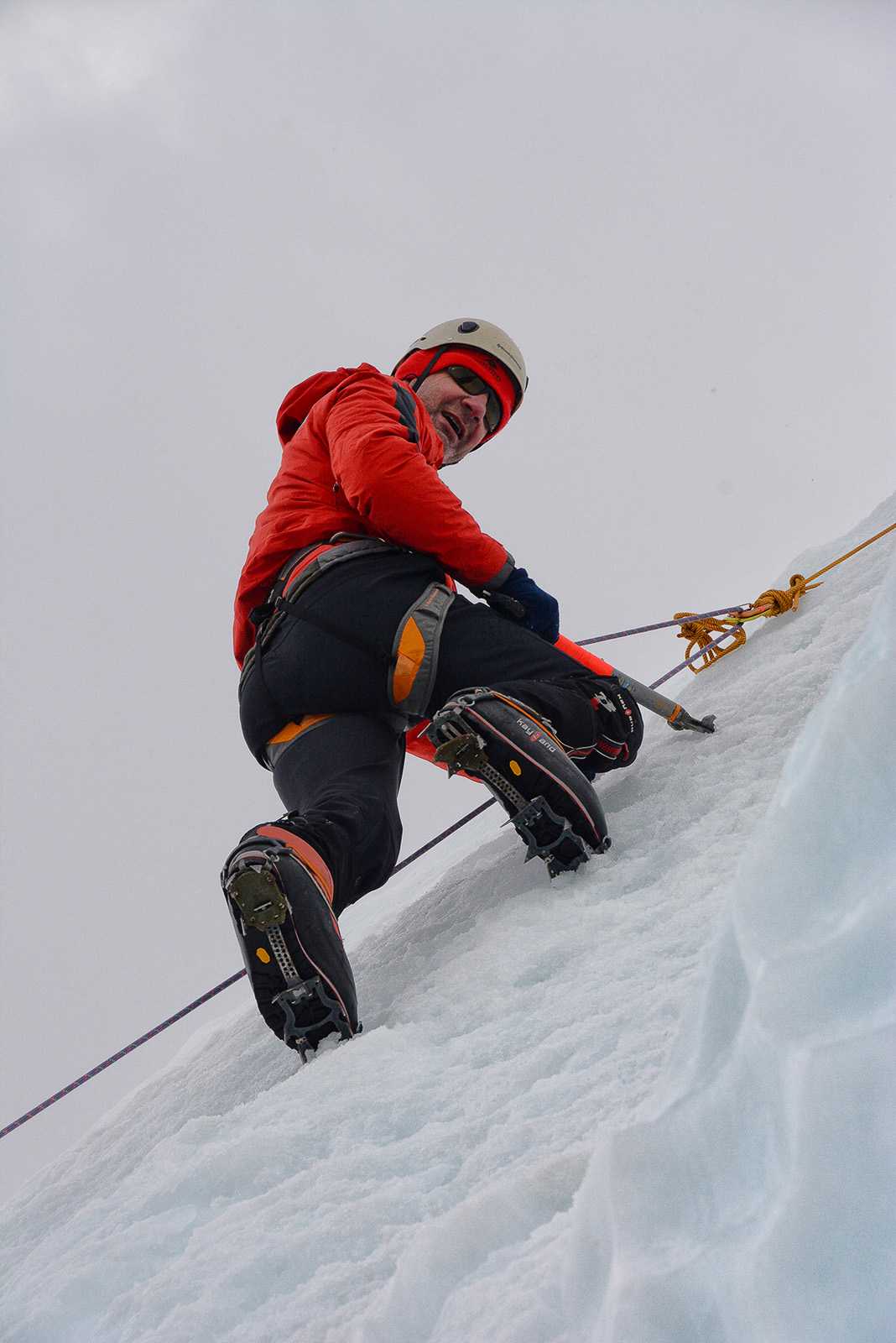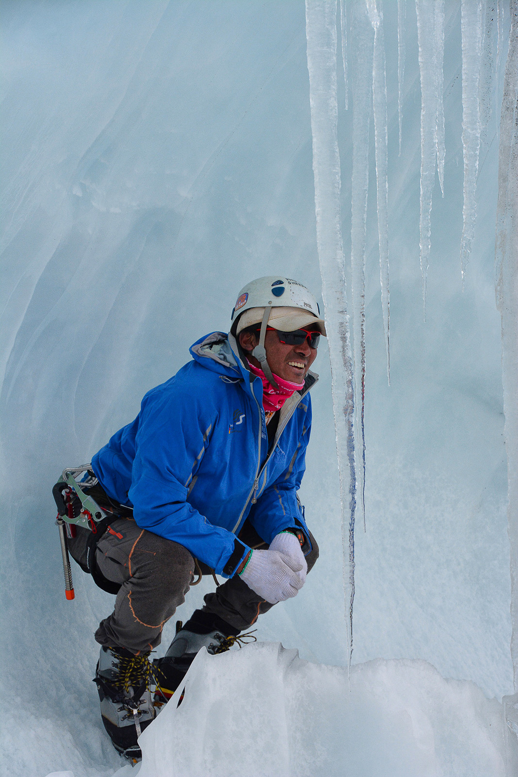 Lunch was served at noon in our mess tent. Afterwards we all went with Panuru to watch Kevin, B-1, Brad and Ake practice ice climbing on the ice wall near our camp. With crampons ready and ice picks in hands each had their turn climbing the 40 foot ice wall as Bob and I watched. It started to snow so we returned to our tents before dinner to try and warm up. When the sun is out it is very warm here but once it is cloudy it gets very cold. At dinner we planned our descent down the mountain tomorrow to Lobuche and then Kevin, Brad, B-1 and Ake with Tashi will hike to Lobuche high base camp to spend the night getting ready to climb Mt Lobuche.