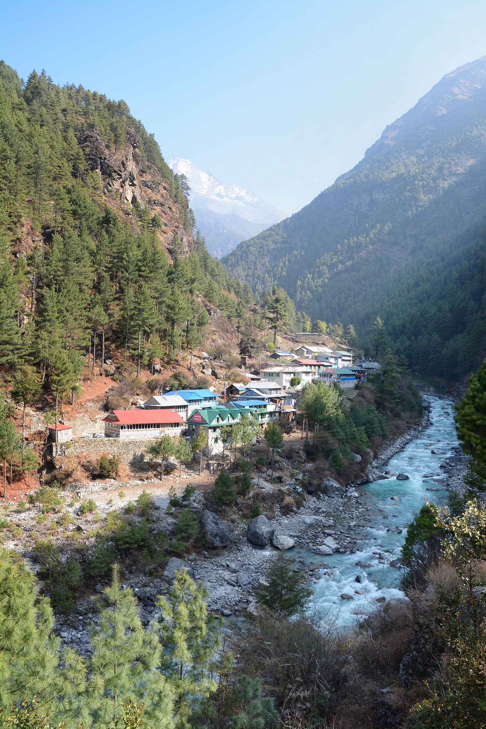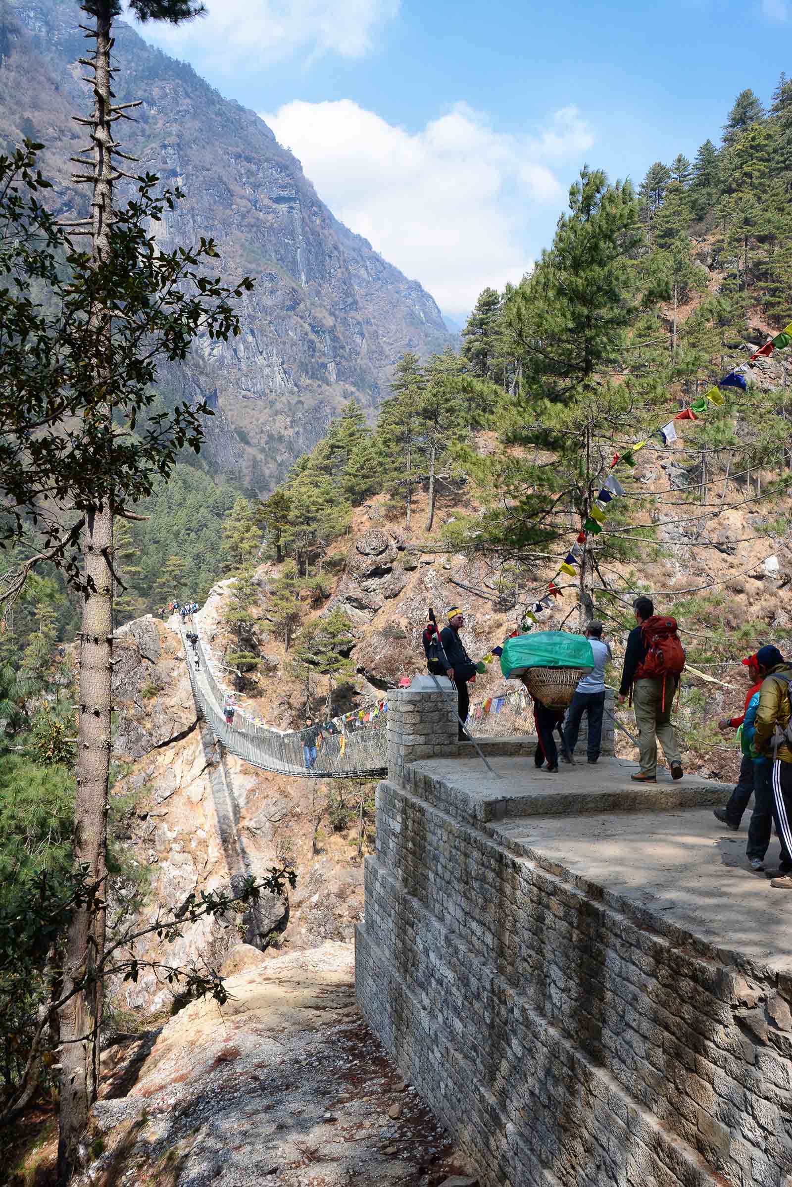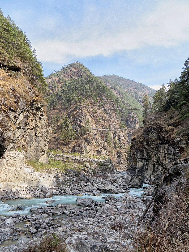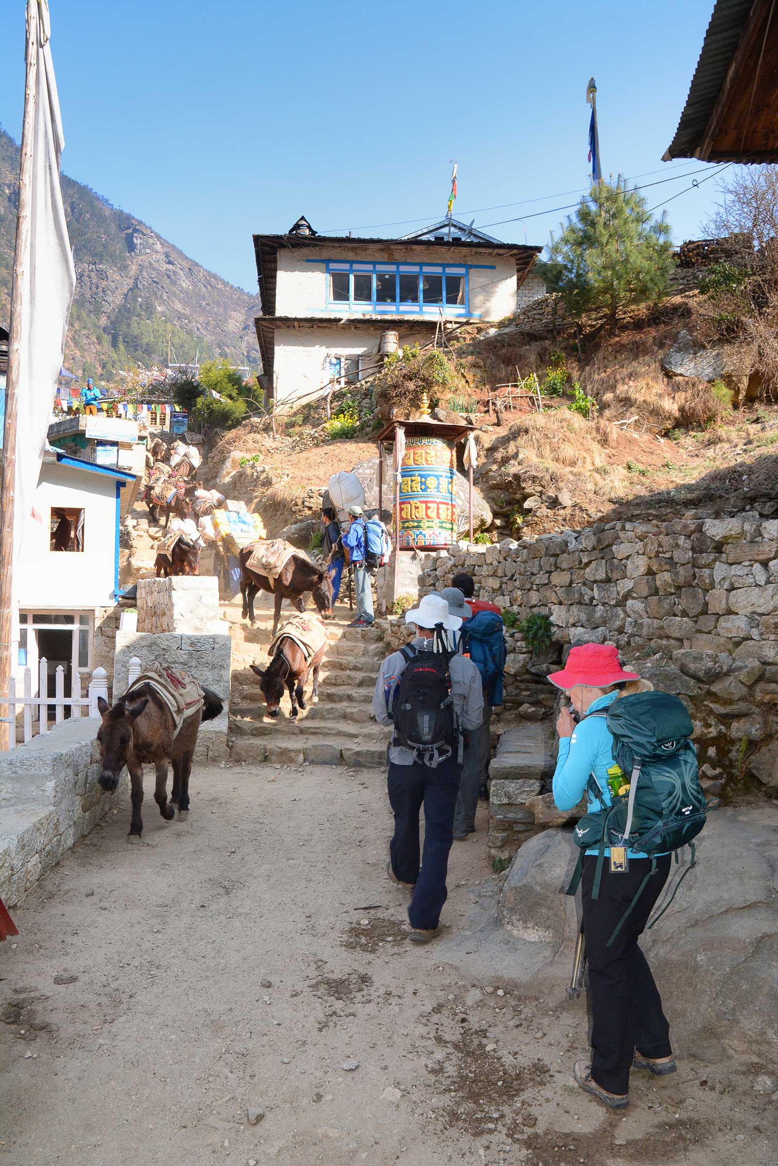 April 18th…Avalanche at Everest Base Camp was the news of the morning. At 6:30am an avalanche swept down between Base Camp and Camp 1 killing 16 Sherpas in its path. The worst tragedy in Everest’s history. We had to continue our hike but we did not know if Kevin, Brad and Ake would be able to climb Mt Everest. This day is one of the most challenging on the entire trek, as we gain more than 2600 feet in altitude to reach Namche Bazaar. We headed out on the trail at 8 am, a beautiful sunny morning, shirts were worn, no jackets needed yet. As we were leaving the Guest House about to climb the stone steps a pack of donkeys were descending the steps with full loads, we waited for them to pass before we went up the steps. Shortly we reached the Sagarmatha (Nepalese name for Everest) National Park entrance and check-in for our trek. We crossed the Dudh Koshi River 3 times this morning and the last one was way up high over the River. The path was very busy today with Sherpas, porters, yaks, donkeys and Trekkers causing traffic jams and yak jams on the bridges and trail. We arrived at Namche about 11:30am. Namche Bazaar, at 11,286 feet altitude, is nestled along the crescent shaped slopes of the Khumbu Valley, it is both charming and exhausting all at the same time. The narrow alleyways are lined with gear shops and tea houses and we were staying at the Hotel Namche which happens to be on one of the upper tiers. Namche is the largest town in the Khumbu Valley with a population of 1500 which swells dramatically in the spring and fall trekking seasons. We had another good meal in the tea house and then went to rest.