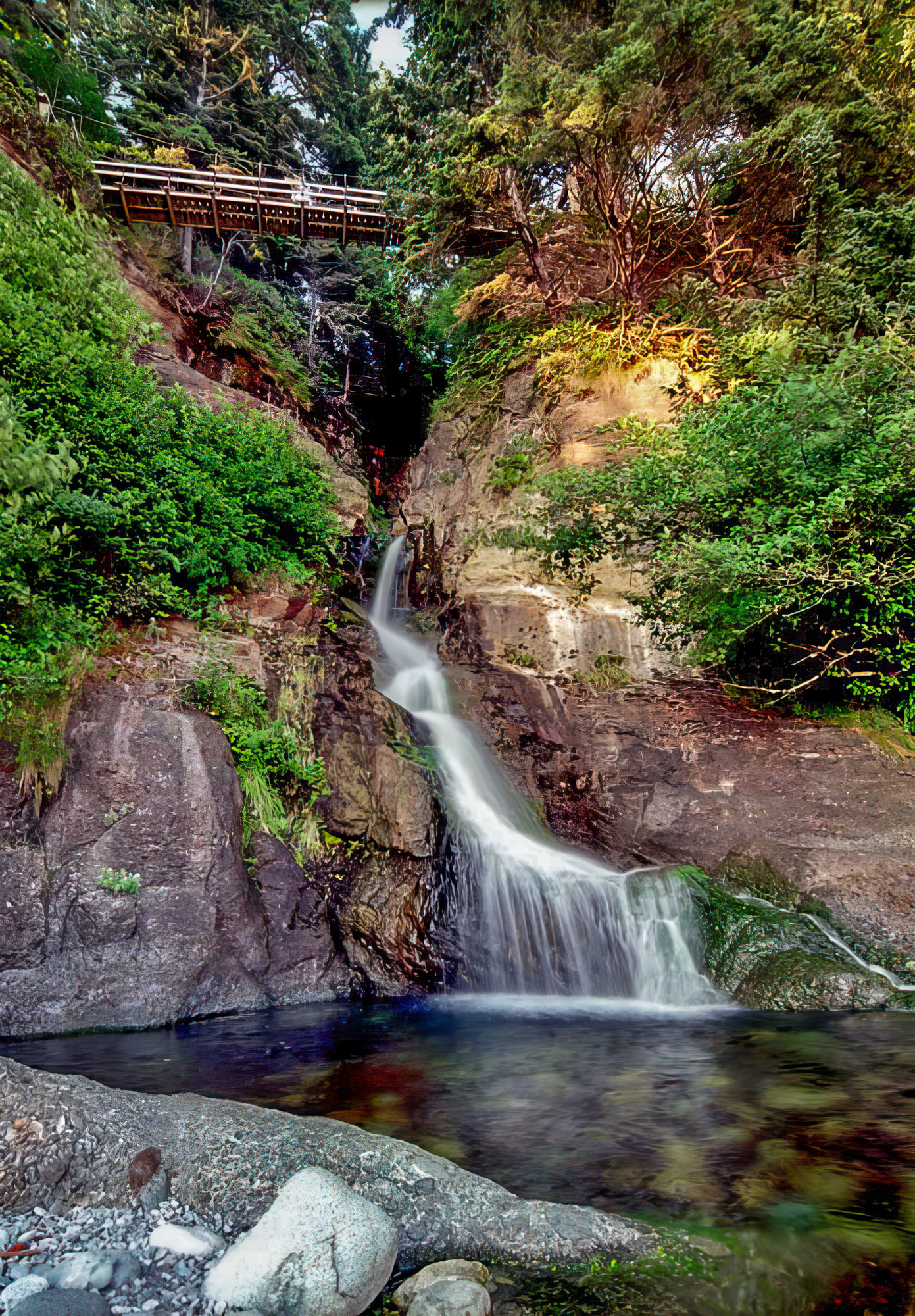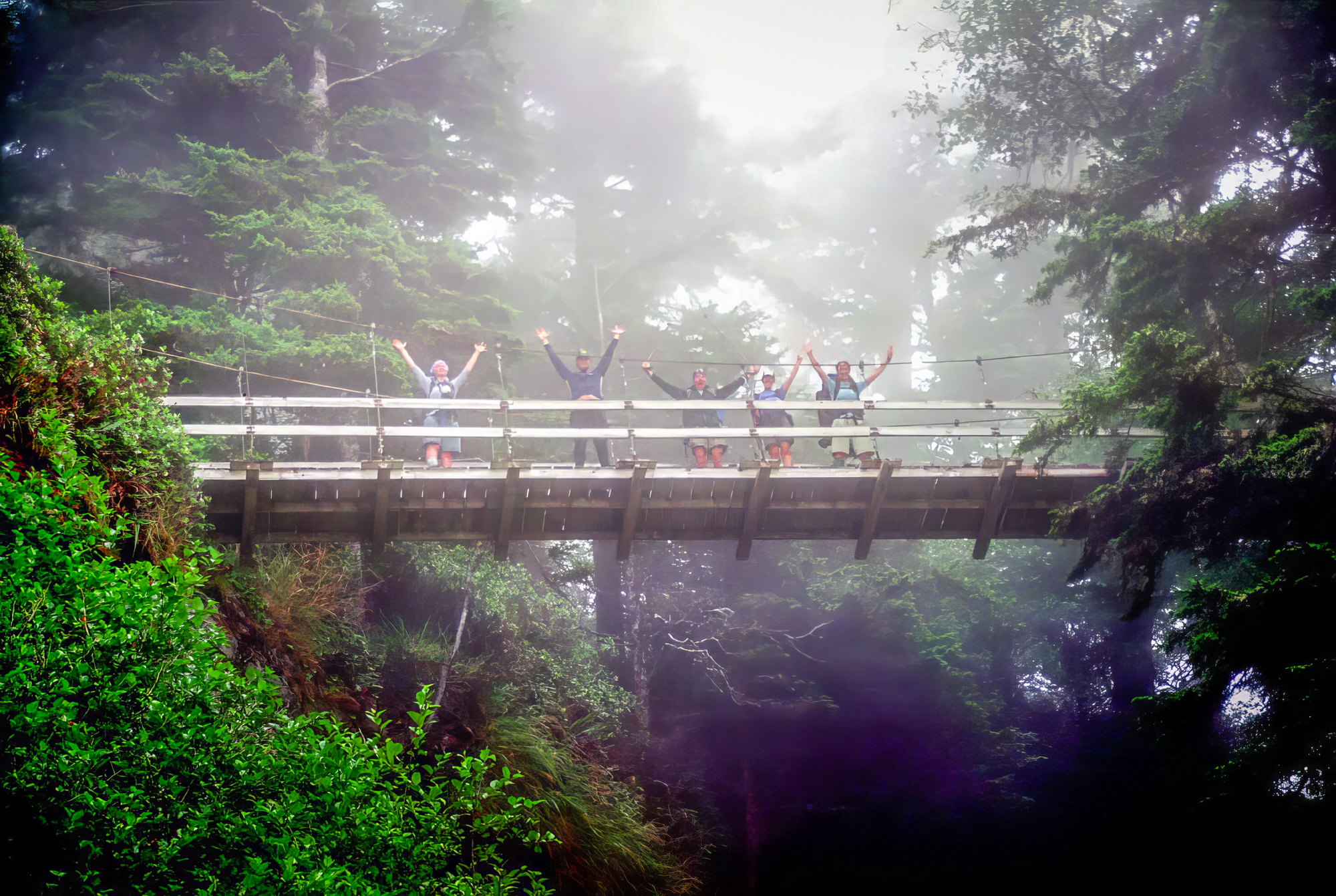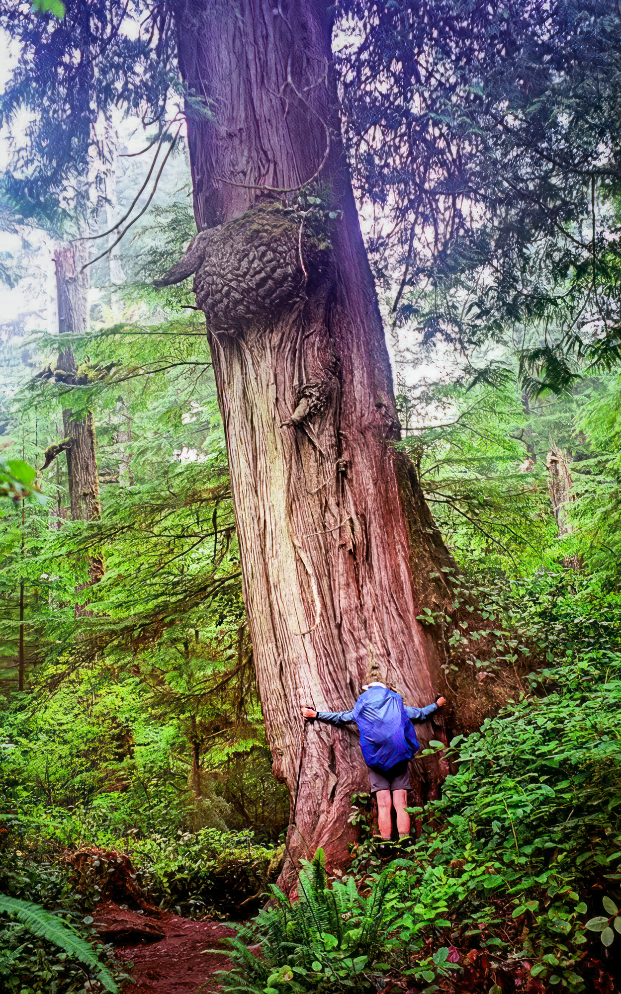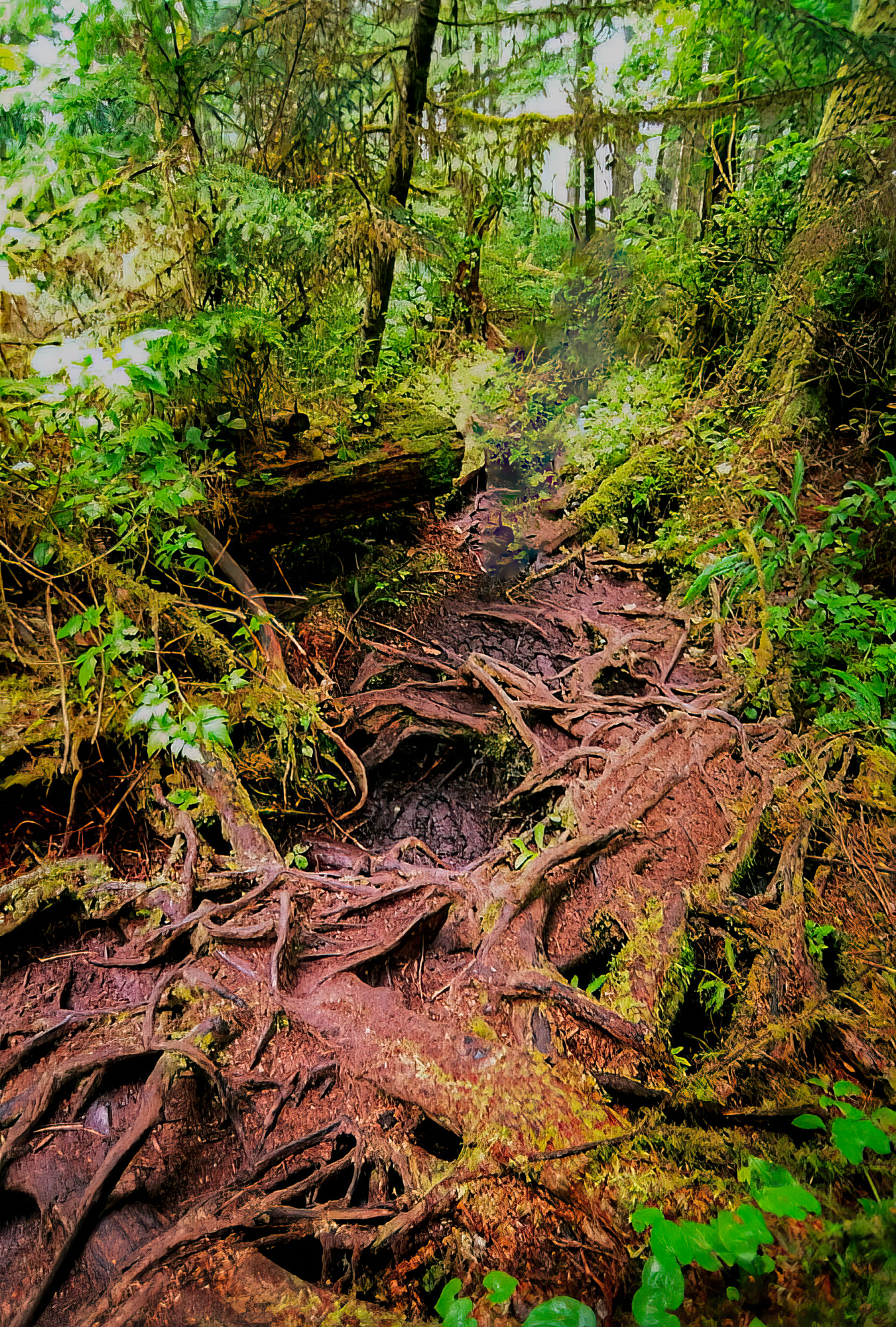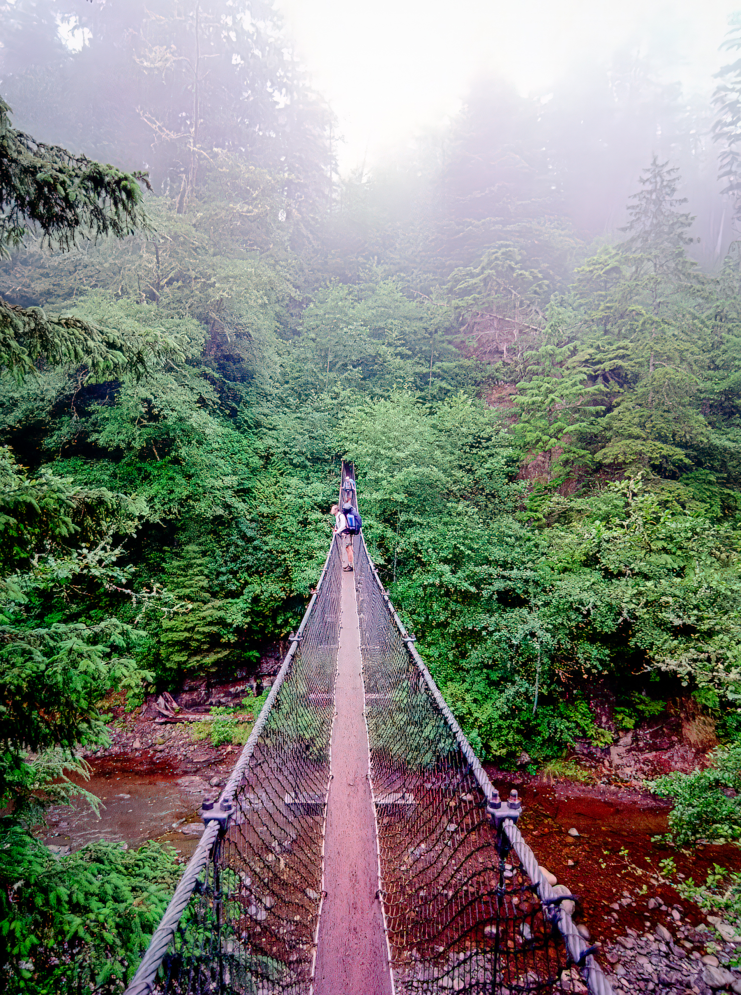 Leaving the exhilaration of the cable car behind, we found ourselves immersed once again in the enchanting old-growth rainforest. Walking amidst towering cedar trees, their branches reaching for the sky, we were humbled by the sheer majesty of these ancient giants. Their trunks, adorned with patches of vibrant moss, stood as silent sentinels, guardians of a world teeming with life. The rainforest floor beneath our feet was a tapestry of lush greenery and dense undergrowth, creating a vibrant carpet. Rays of sunlight pierced through the thick canopy and marine layer mist above, casting a dappled etherial glow upon the forest floor.