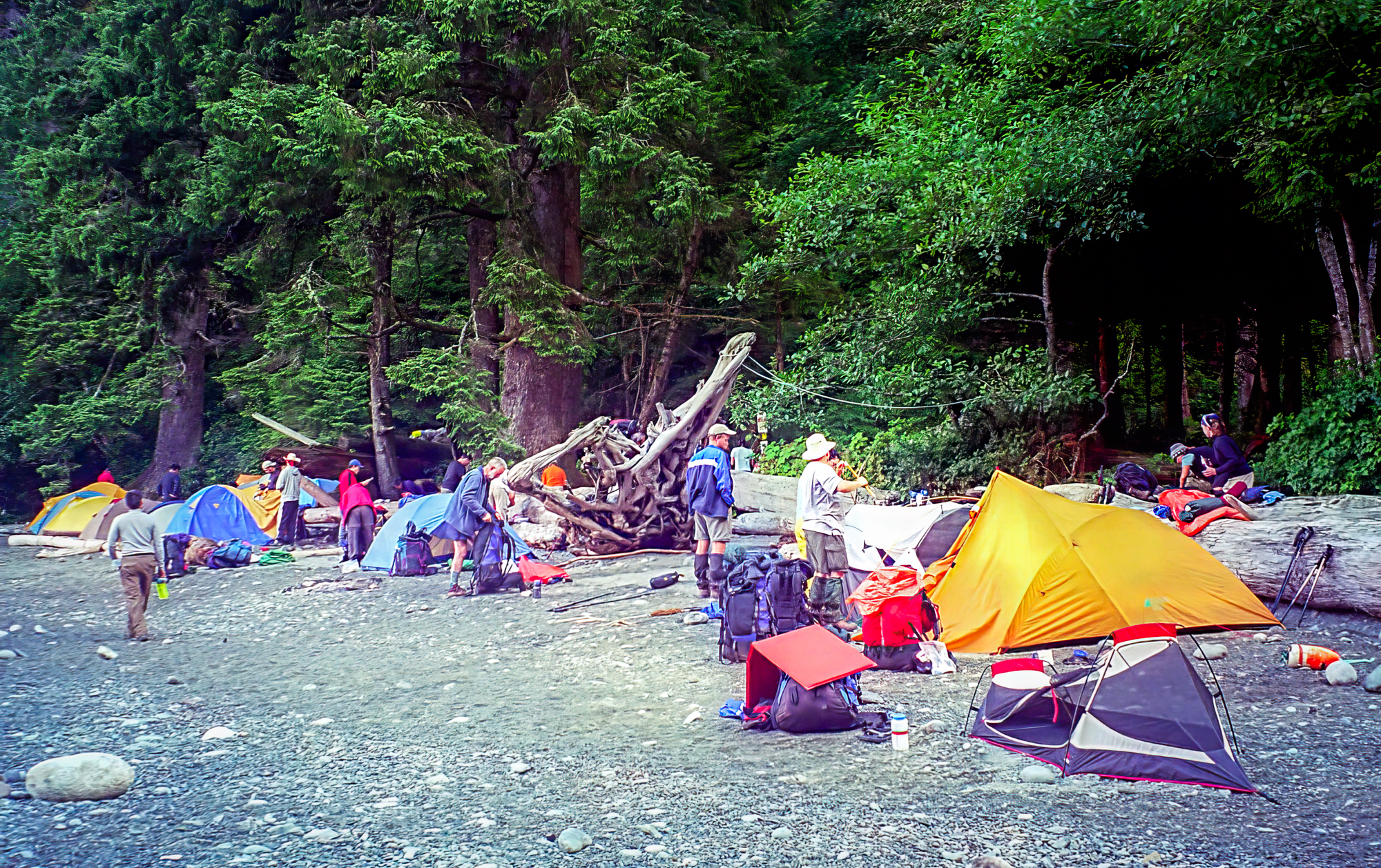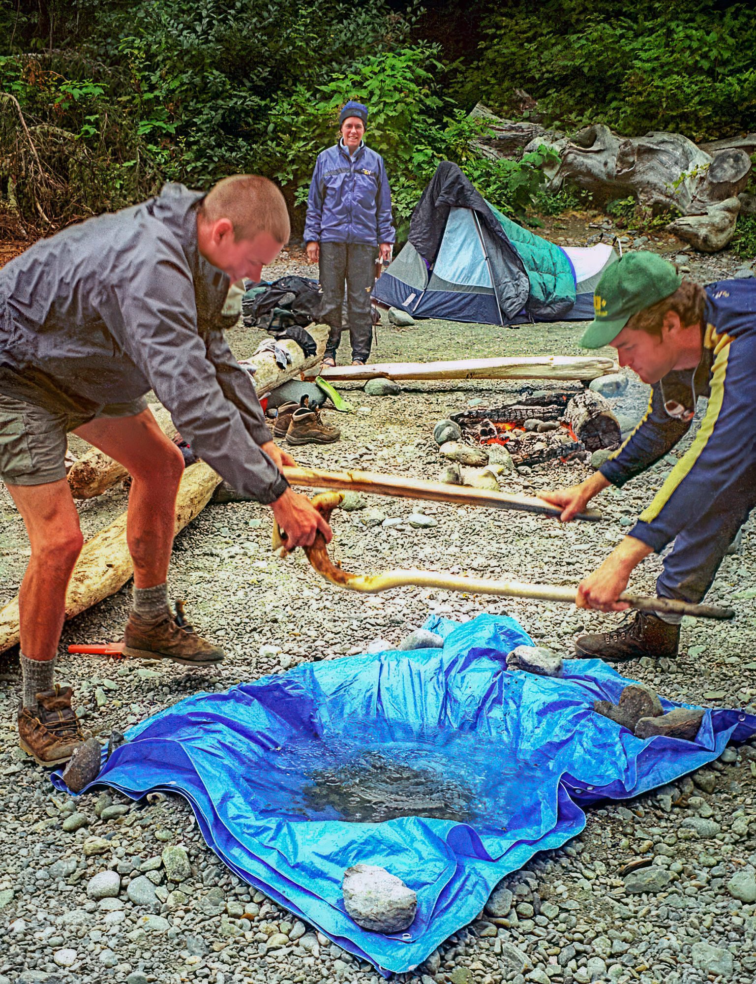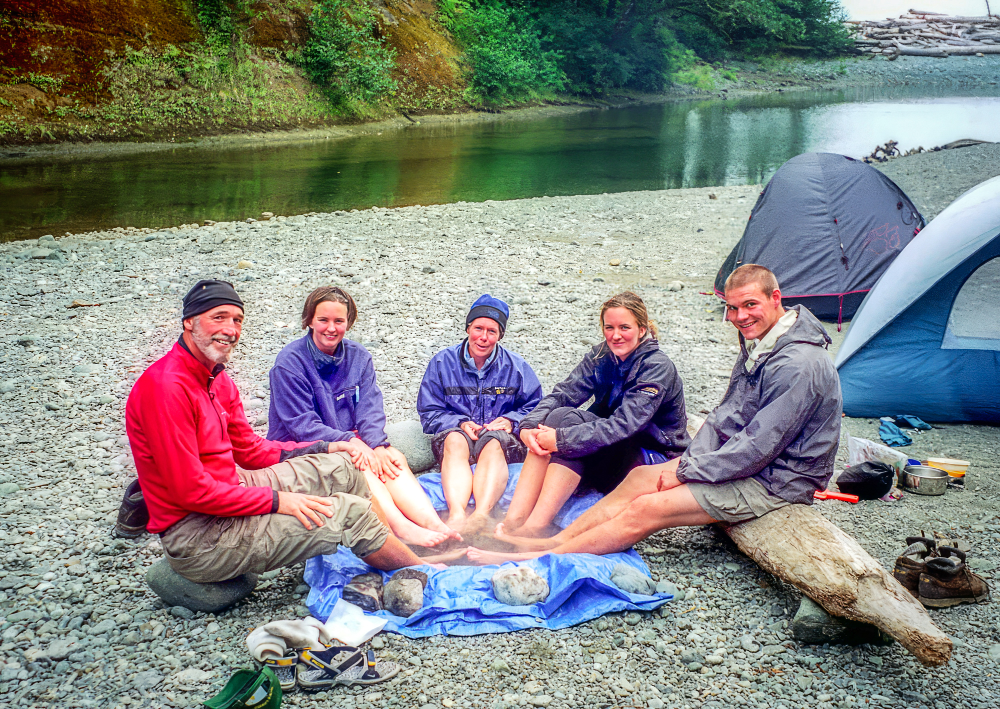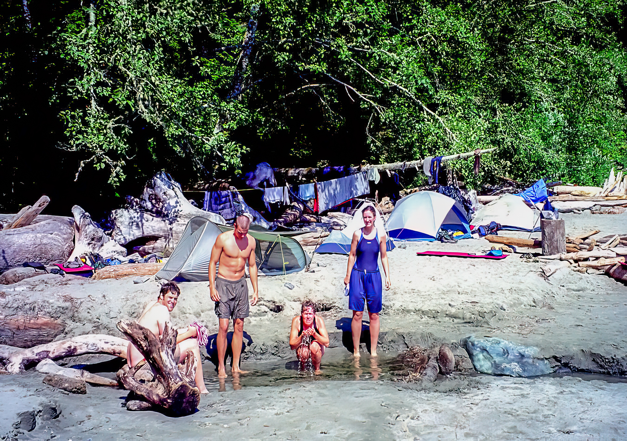 As the day drew to a close, we found ourselves making camp on the sandy beach next to one of the many creeks emptying onto the ocean. Eager to refresh ourselves, we braved the chilly waters for a revitalizing swim. As night fell, we gathered around a roaring fire, its warmth and crackling flames casting dancing shadows upon the sand. In a stroke of ingenuity, Eric and Jonathon took heated rocks from the fire, creating a makeshift foot bath that brought much-needed warmth and relaxation to our tired feet. It was a moment of shared bliss. Click on thumbnail to view image