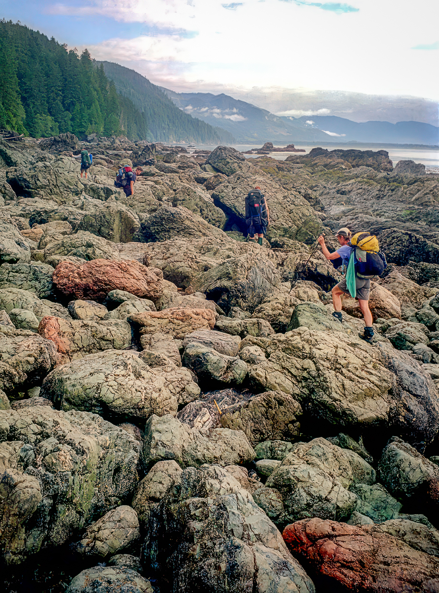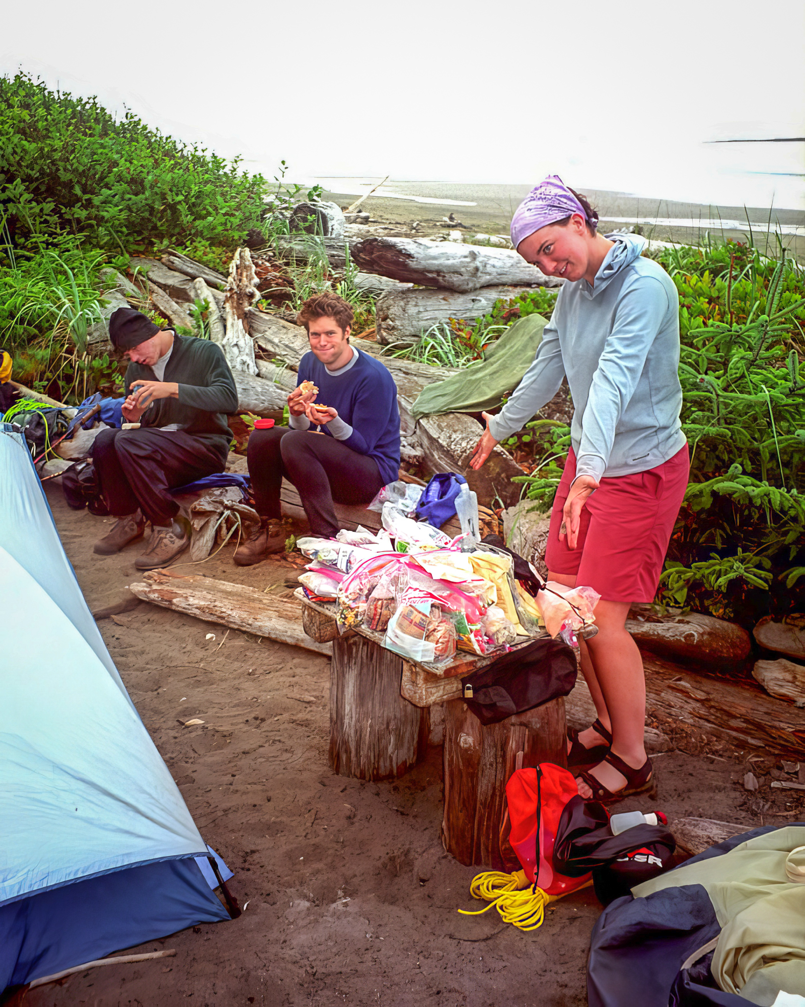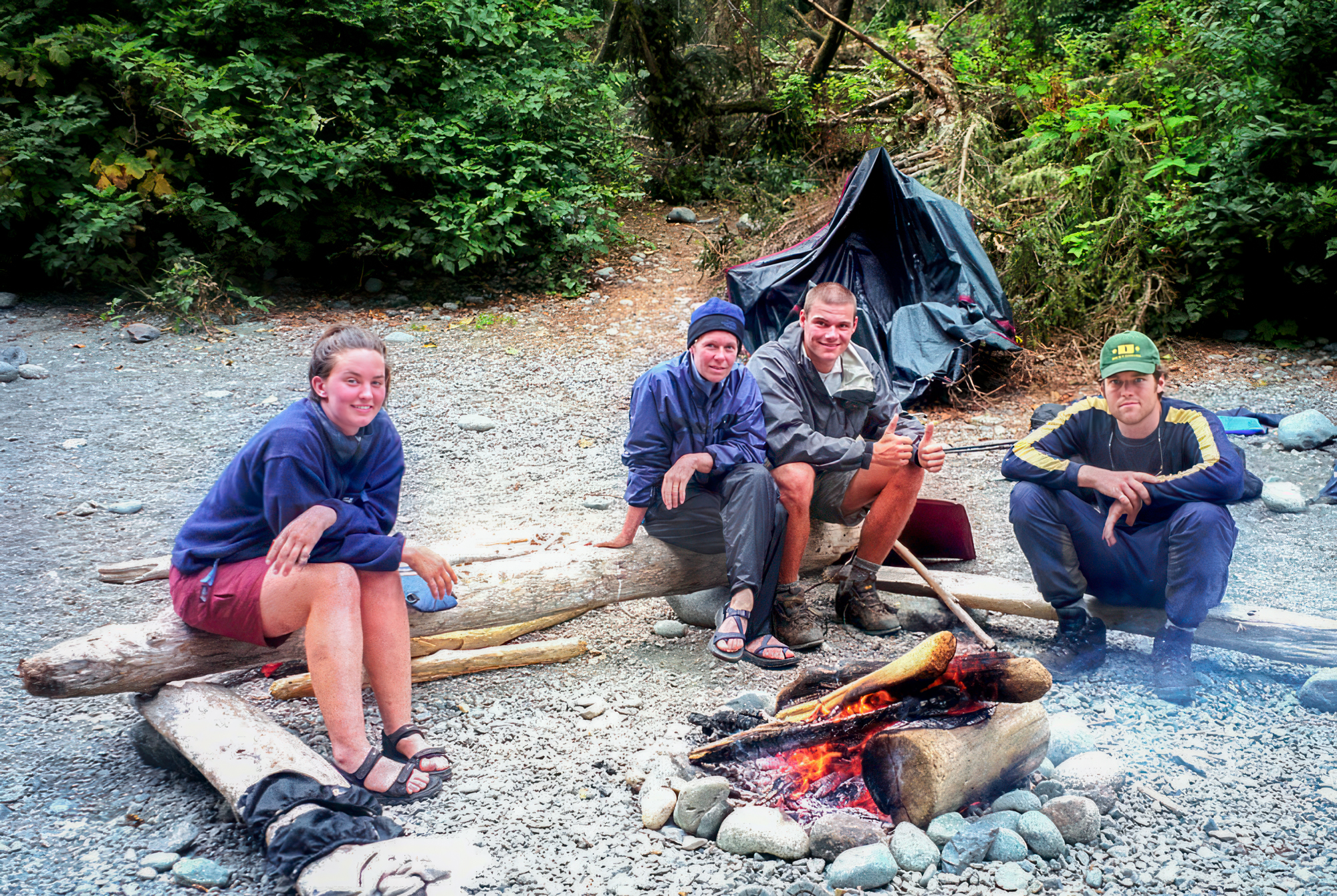 As the day drew to a close, we found ourselves making camp on the sandy beach next to one of the many creeks emptying onto the ocean. Eager to refresh ourselves, we braved the chilly waters for a revitalizing swim. As night fell, we gathered around a roaring fire, its warmth and crackling flames casting dancing shadows upon the sand. In a stroke of ingenuity, Eric and Jonathon took heated rocks from the fire, creating a makeshift foot bath that brought much-needed warmth and relaxation to our tired feet. It was a moment of shared bliss. Click on thumbnail to view image