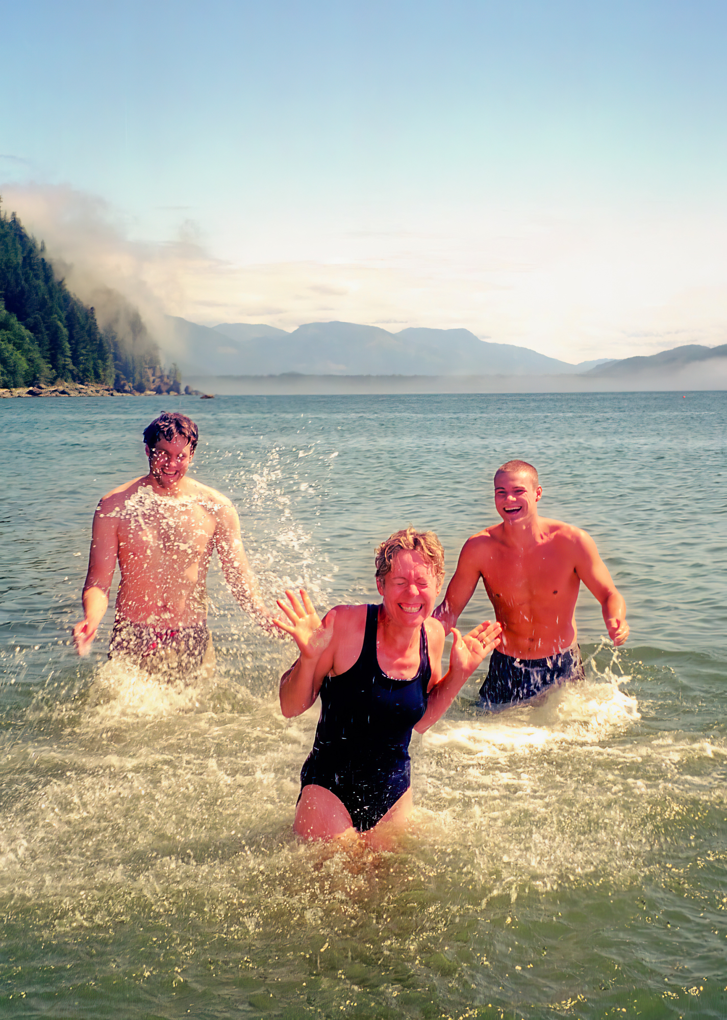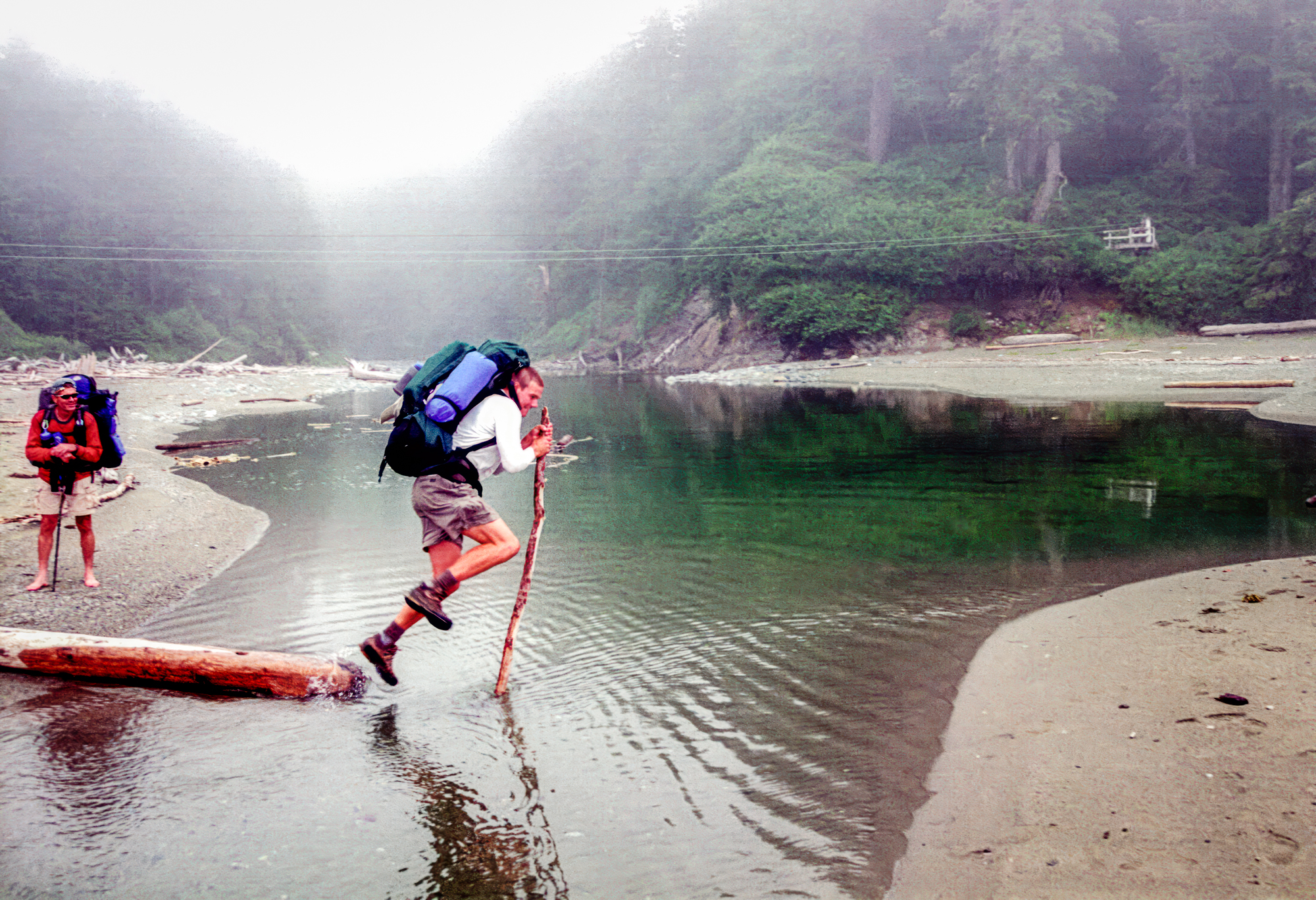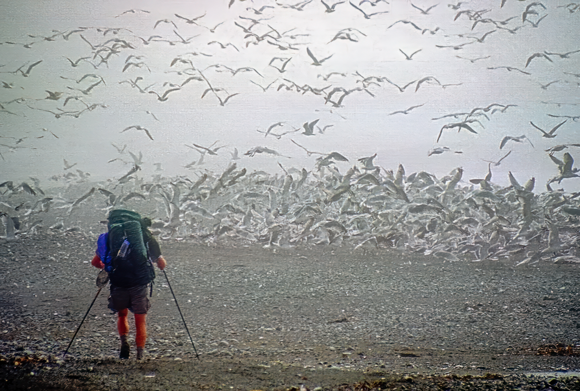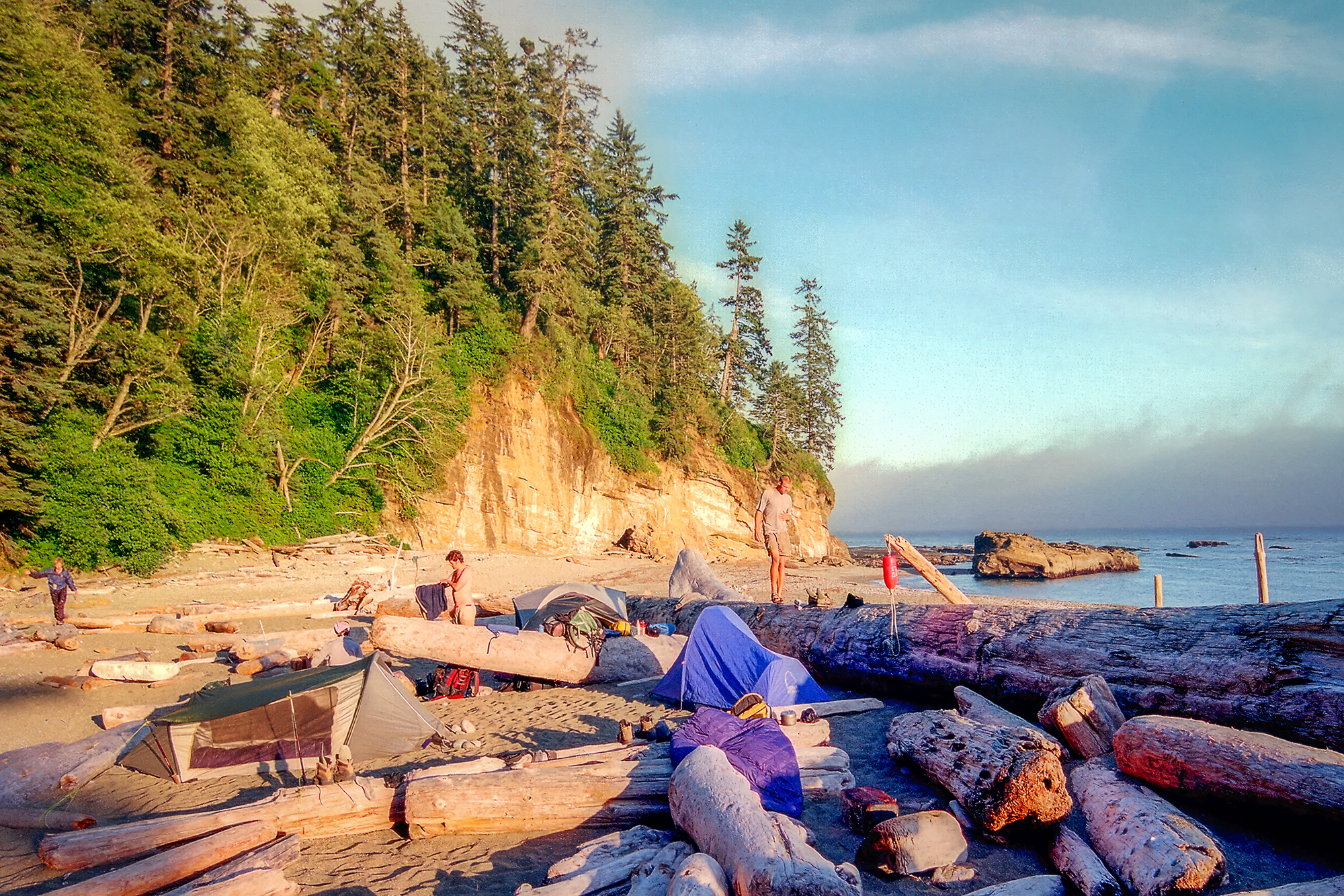As the day drew to a close, we found ourselves making camp on the sandy beach next to one of the many creeks emptying onto the ocean. Eager to refresh ourselves, we braved the chilly waters for a revitalizing swim. As night fell, we gathered around a roaring fire, its warmth and crackling flames casting dancing shadows upon the sand. In a stroke of ingenuity, Eric and Jonathon took heated rocks from the fire, creating a makeshift foot bath that brought much-needed warmth and relaxation to our tired feet. It was a moment of shared bliss. Click on thumbnail to view image