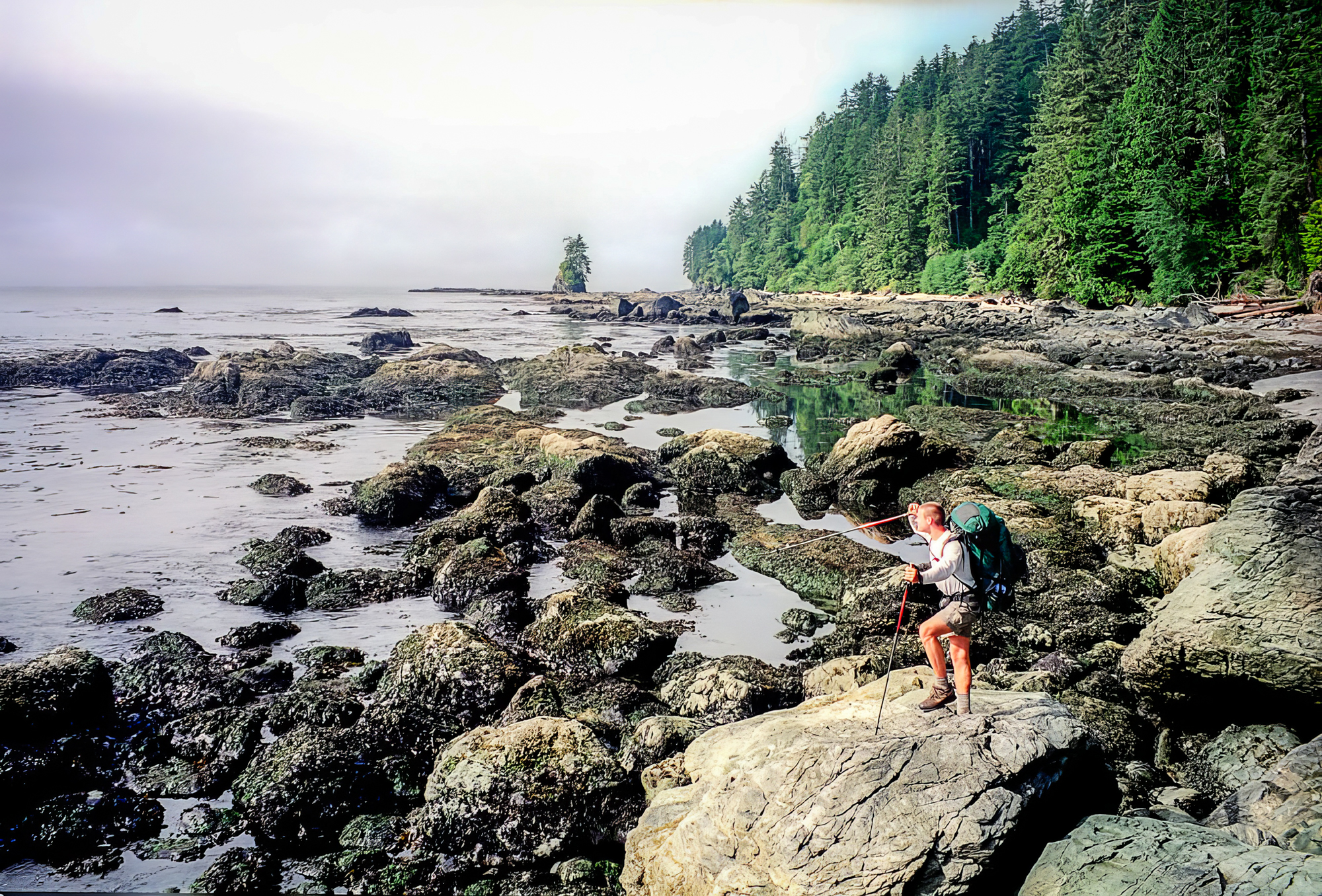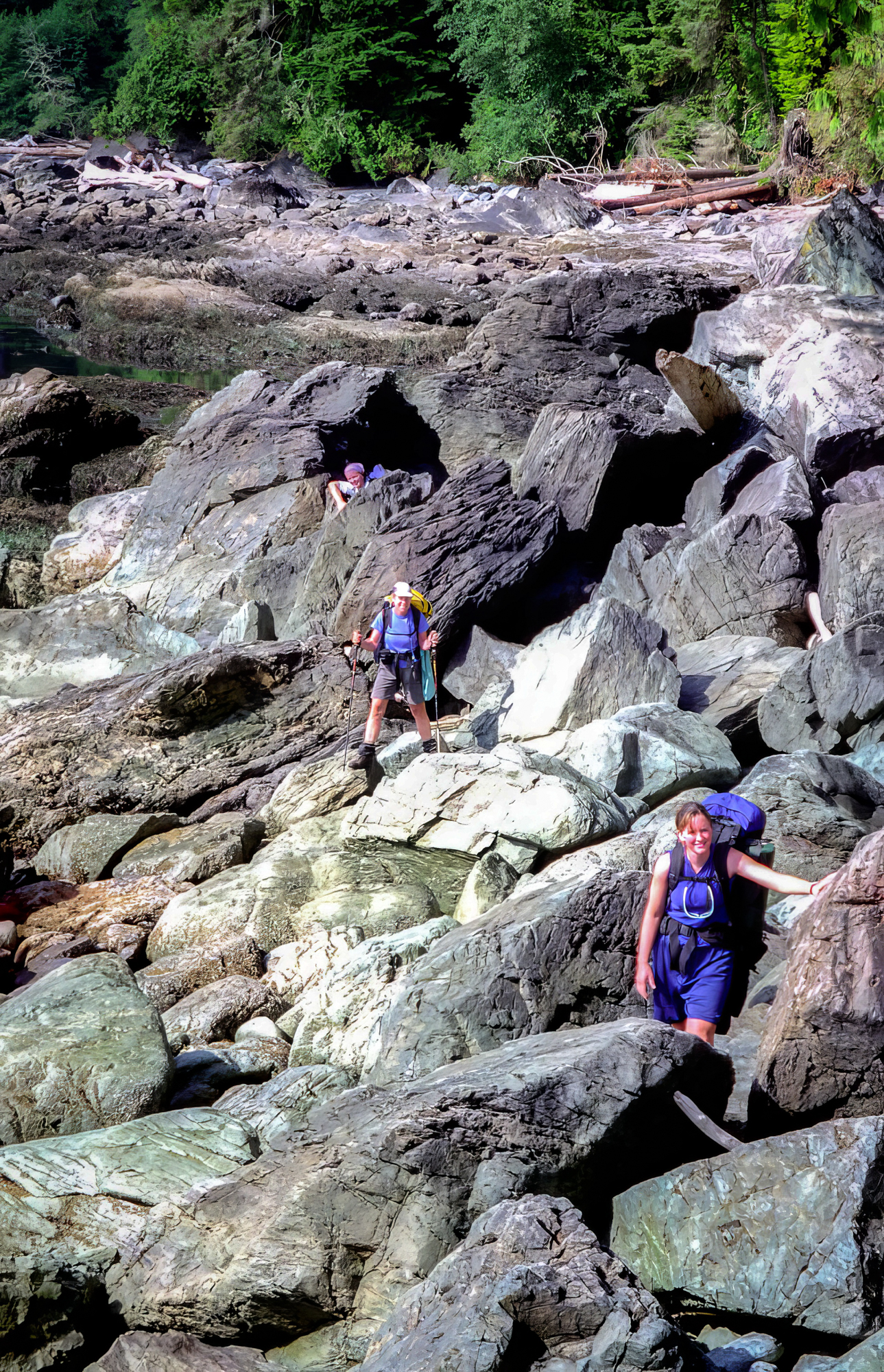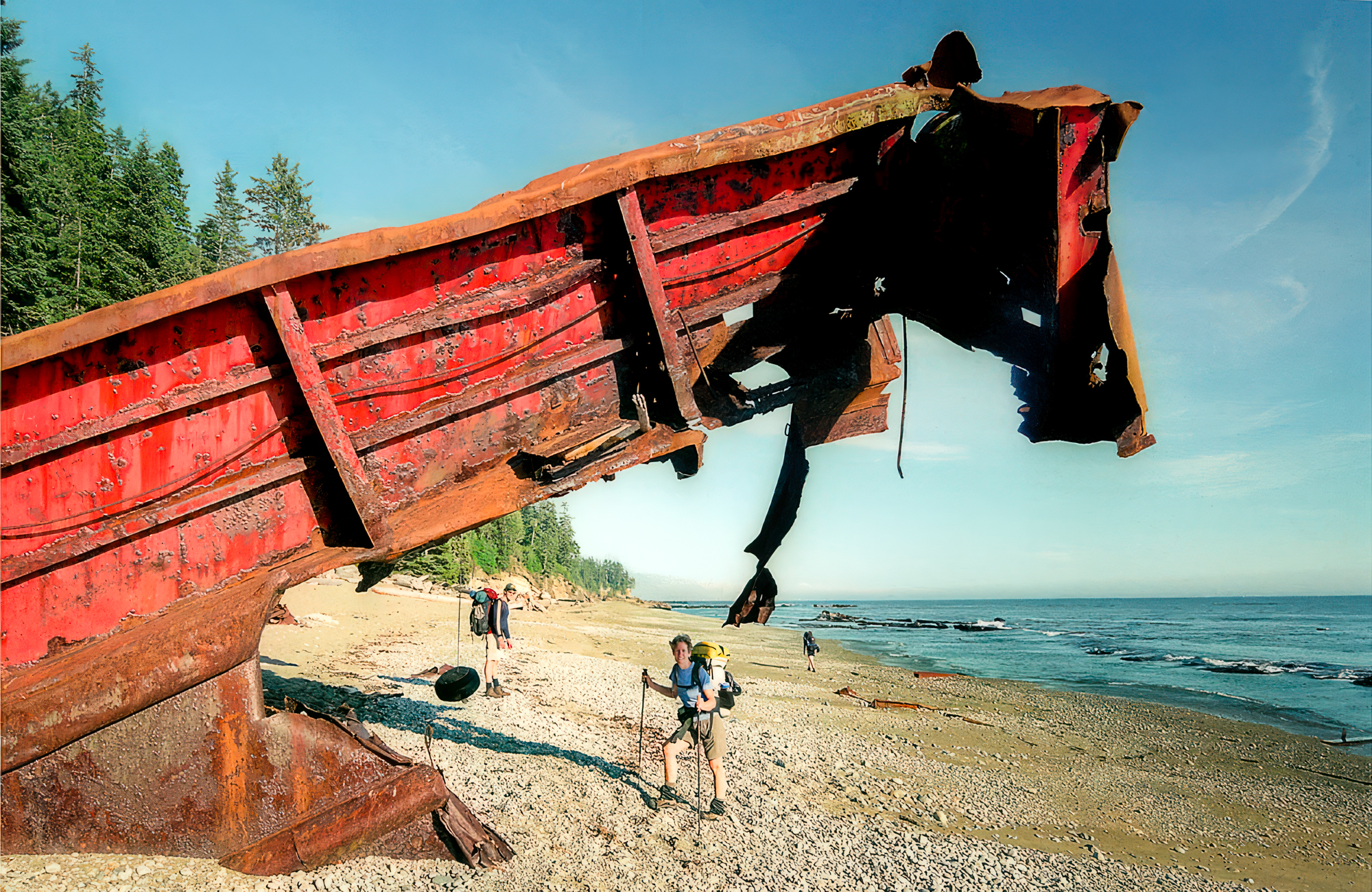 The final day of journey along the West Coast Trail dawned, and with a mix of excitement and a tinge of nostalgia, we rose early to embark on the last leg of our adventure towards Port Renfrew. Leaving the sandy beach behind, the trail led us uphill, guiding us back into the rainforest. As we ascended, the lush greenery enveloped us, providing a refreshing respite from the sun’s warm rays. Towering cedar trees and a dense undergrowth painted a vibrant tapestry of nature’s bounty. Along the trail, we encountered several derelict donkey engines, silent witnesses to the logging history that had shaped this land. These remnants stood as humble reminders of the human endeavors that had once echoed through these ancient forests.