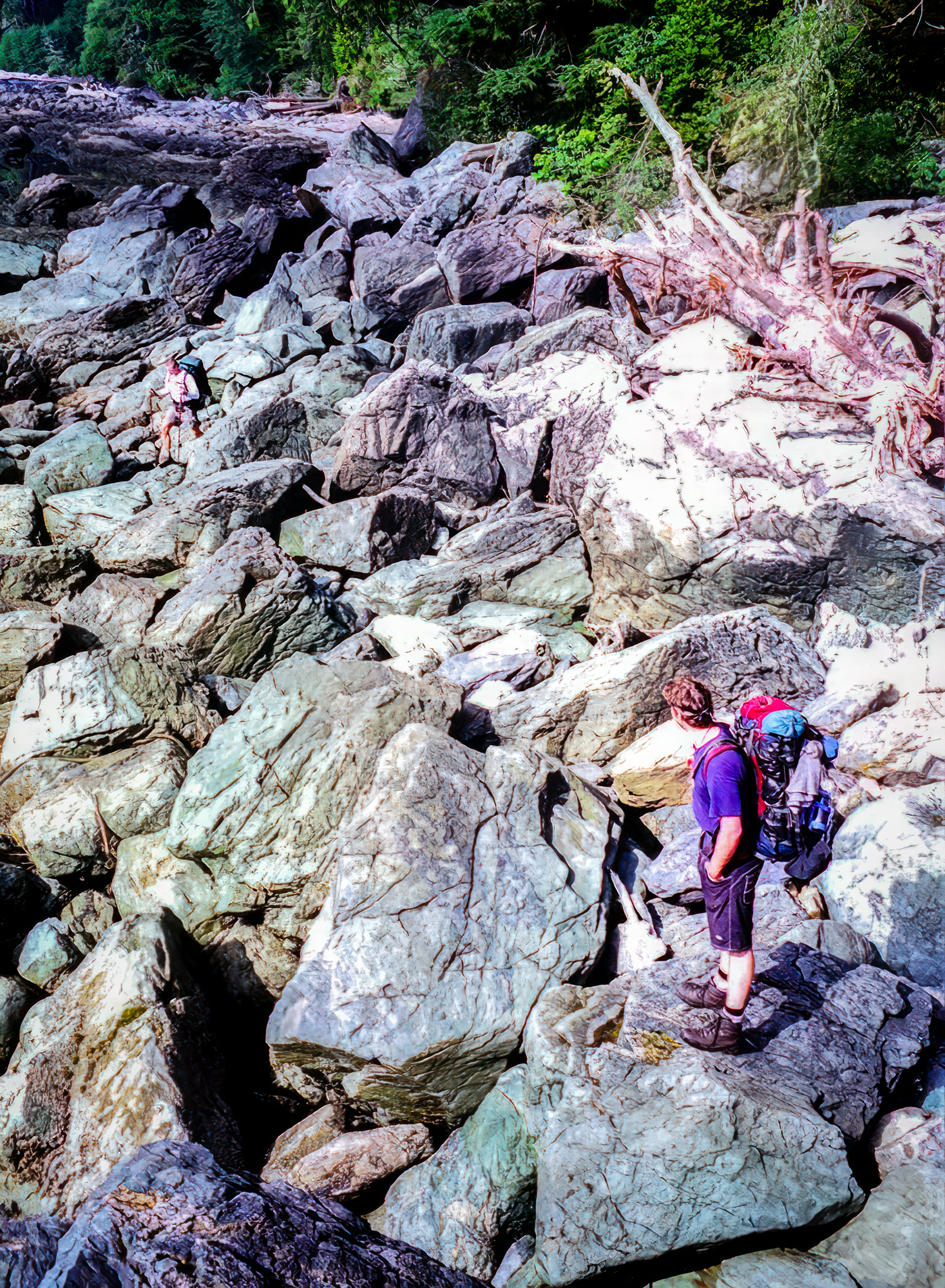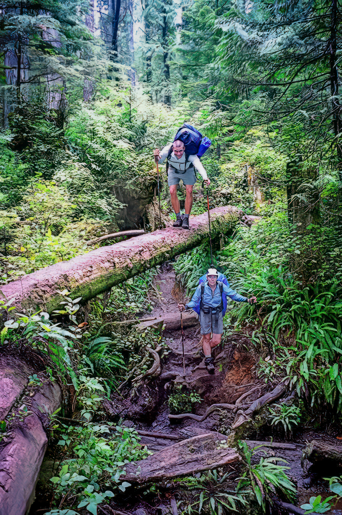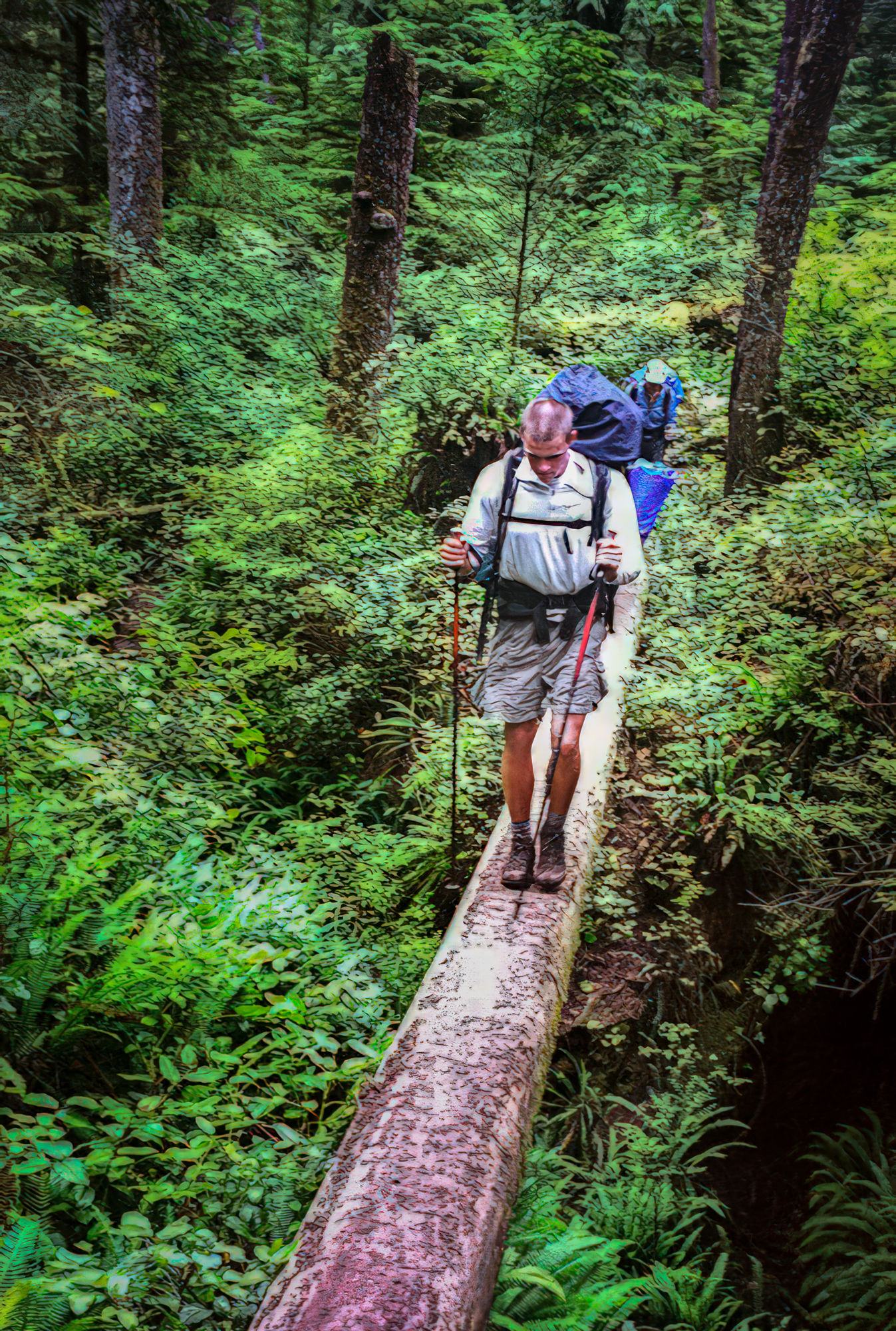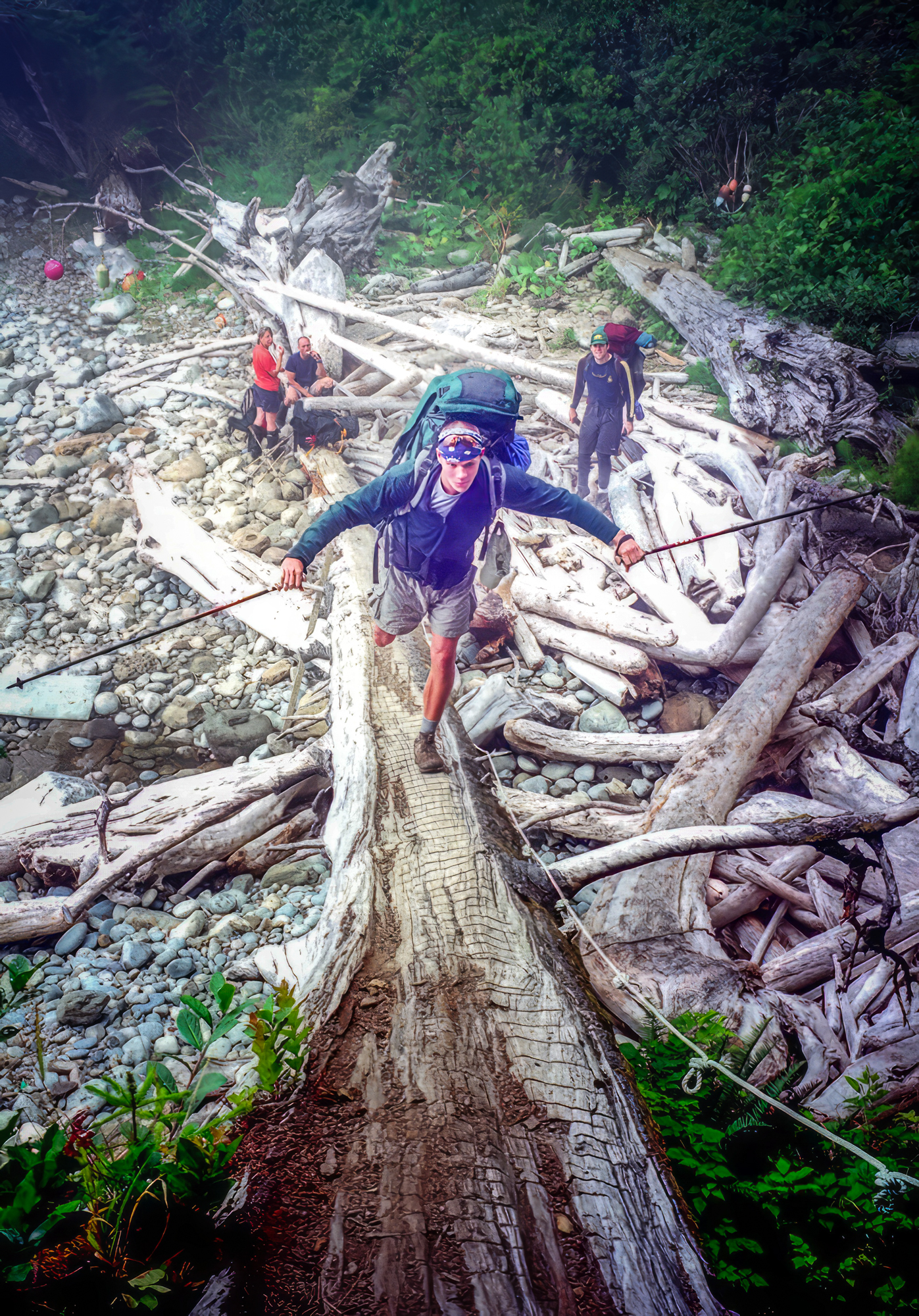 Navigating the trail through the rainforest presented its own unique challenges. Sections of the path became gnarled and twisted, adorned with massive tree roots that seemed to have a life of their own. In other areas we had to cross over obstacles on fallen trees balancing our heavy packs. These natural obstacles demanded our attention and care, requiring us to carefully pick our way through the labyrinth of roots and forest debris. It was a test of balance and agility, reminding us that nature is both beautiful and untamed. We were fortunate that there was no rain which would have made these sections of trail even more difficult to negotiate.