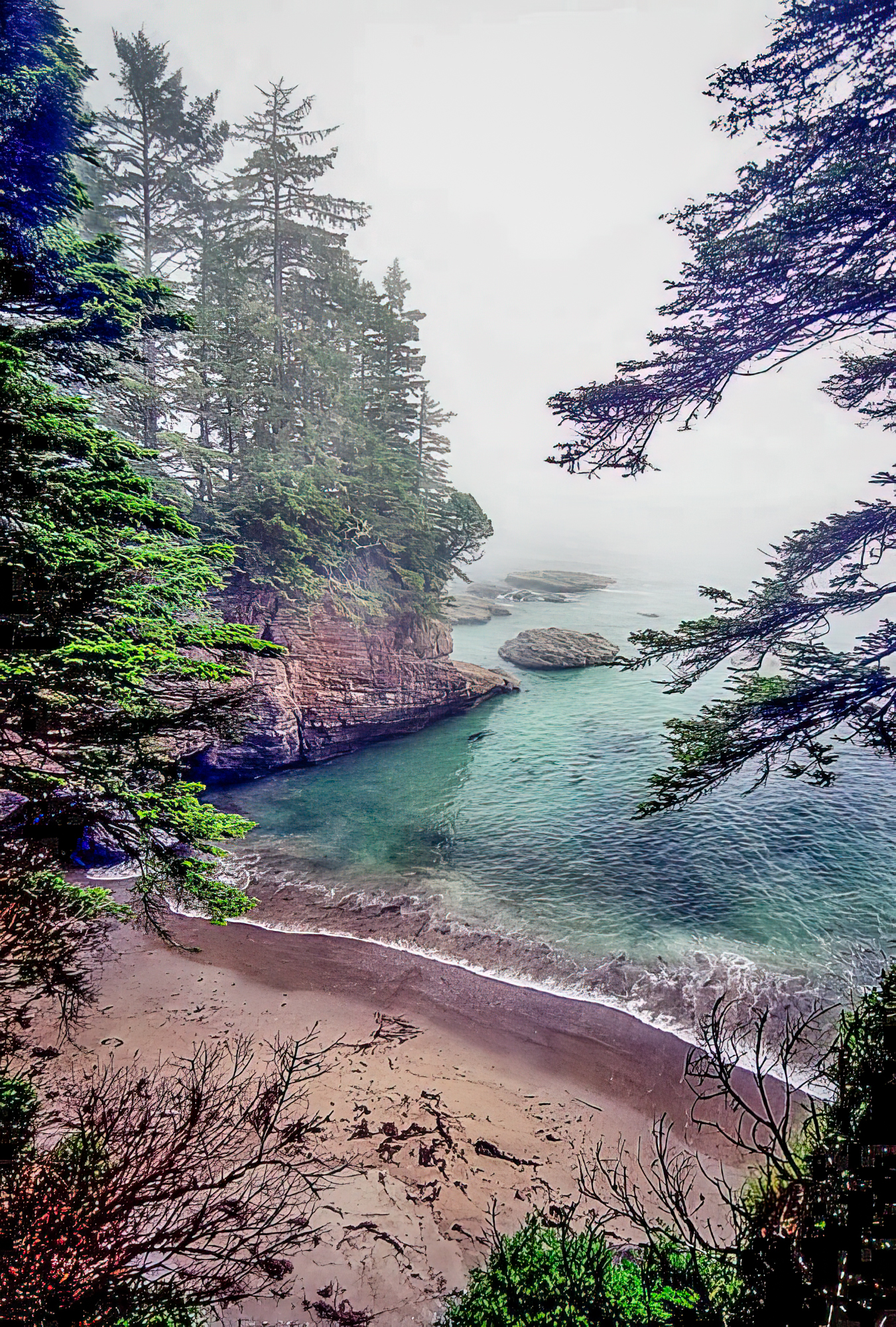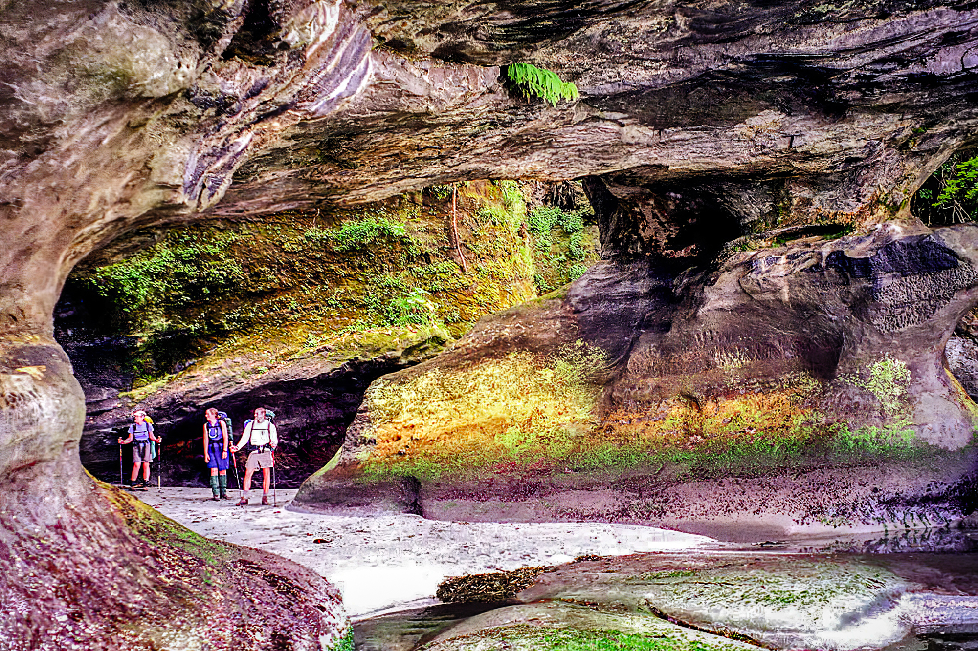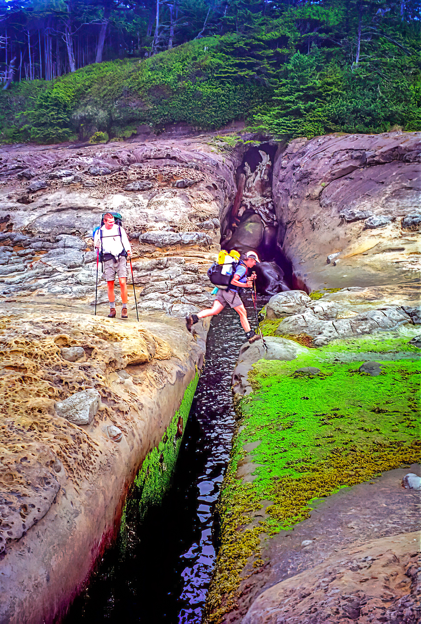 Today the trail led us mostly along the shoreline, immersing us in a thrilling array of activities. We embraced the spirit of the trail as we engaged in chasm jumping, carefully leaping from one rock to another, testing our agility and balance. Boulder hopping became second nature as we ventured further along the shoreline, each leap a dance with the ancient rocks that lay strewn in our path. We marveled at the sheer size and grandeur of the sea stacks that rose majestically from the ocean’s embrace. These towering sentinels stood as testaments to the indomitable power of nature, their rugged beauty captivating our senses.nAmongst the rugged cliffs, we encountered sea caves, mysterious and alluring. One cave, in particular, beckoned us with its vastness, inviting us to explore its depths on foot. Stepping into the cool darkness, we found ourselves in a hidden world, shaped by the relentless forces of the sea.