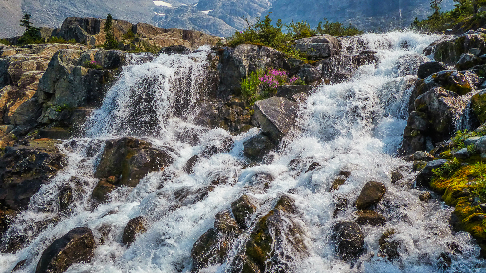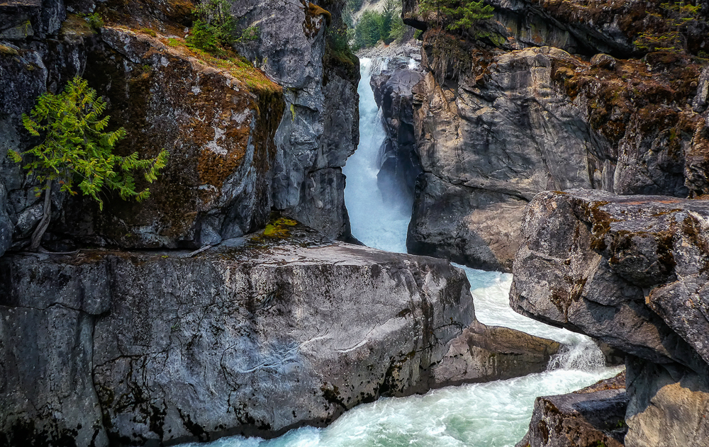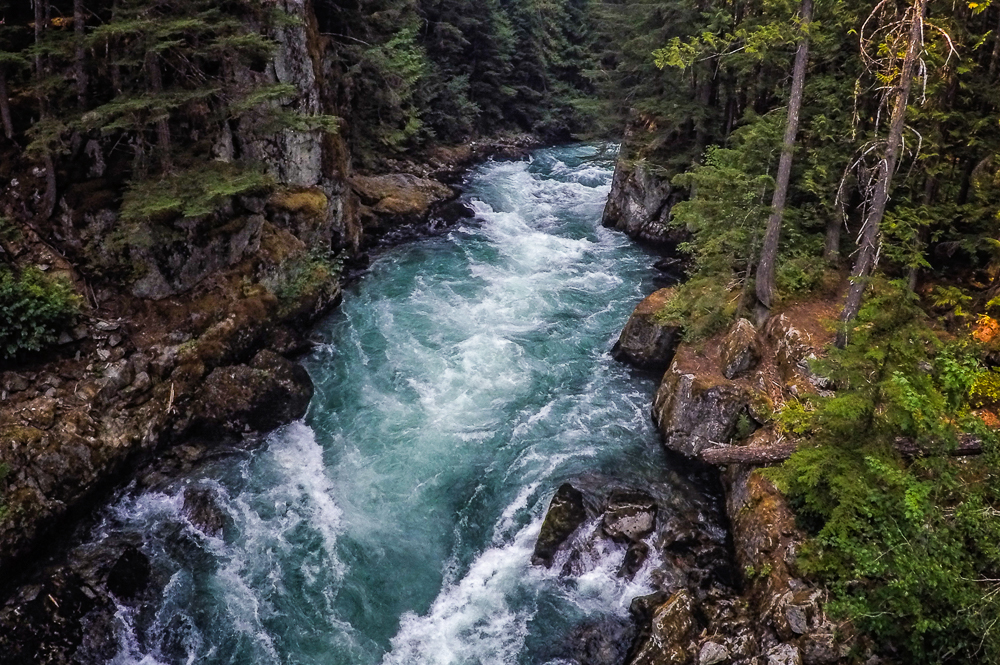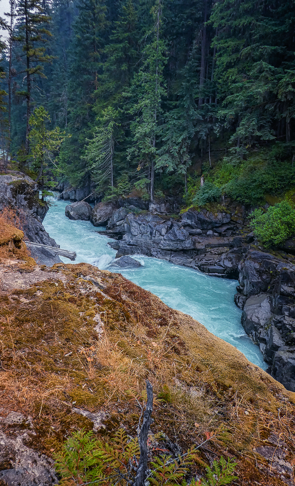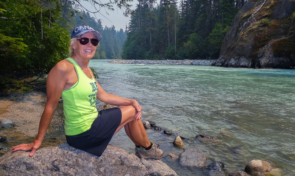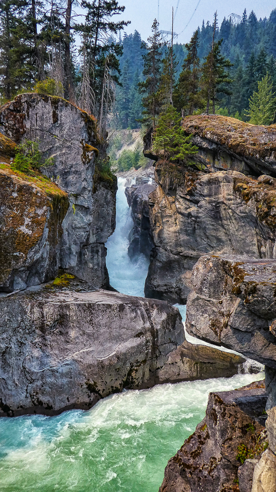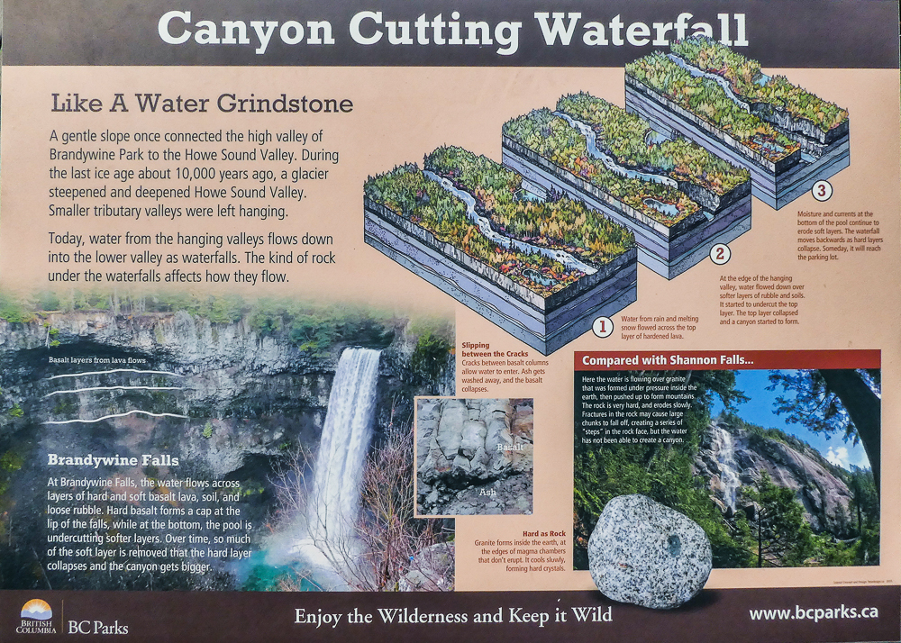The next day we decided to stay low because of the smoke. We drove to Nairn Falls Provincial Park just 20 minutes north of Whistler located on the Green River, and took the 1.5 km hiking trail to the falls. Nairn Falls, total height of 130 feet, is a double waterfall connected by a small canyon which throttles the flow of the Green River just before falling into the Pemberton Valley. The amount of water was very impressive as it thundered through the canyon. Our next stop was to the Brandywine Falls Provincial Park, to see Brandywine Falls a 70 m waterfall and an iconic landmark along the Sea to Sky Highway. It has been years since we visited these massive falls and they still amaze me with their grandeur. Click on thumbnail to view images