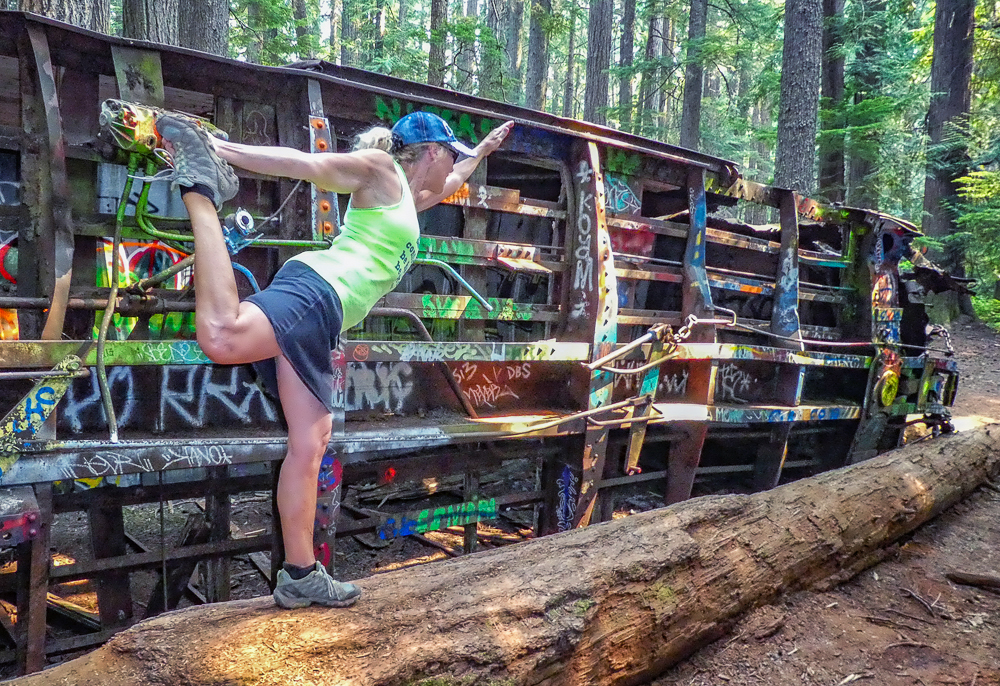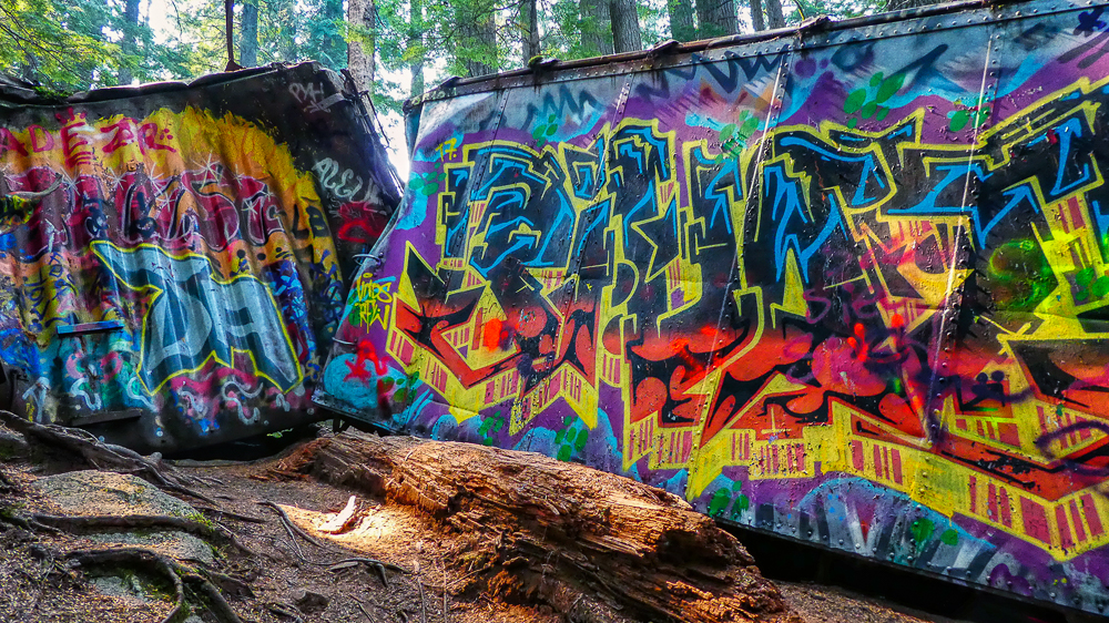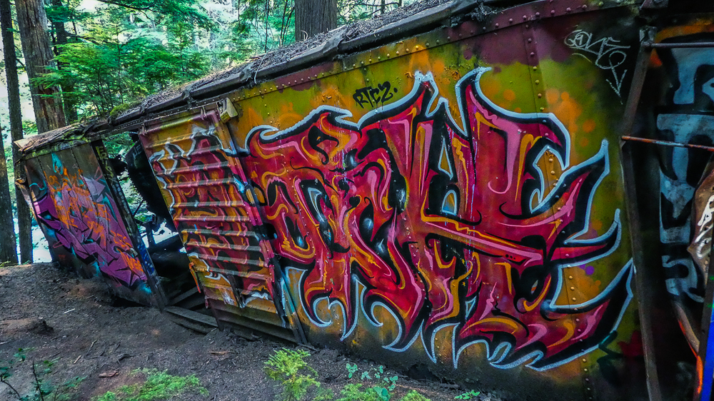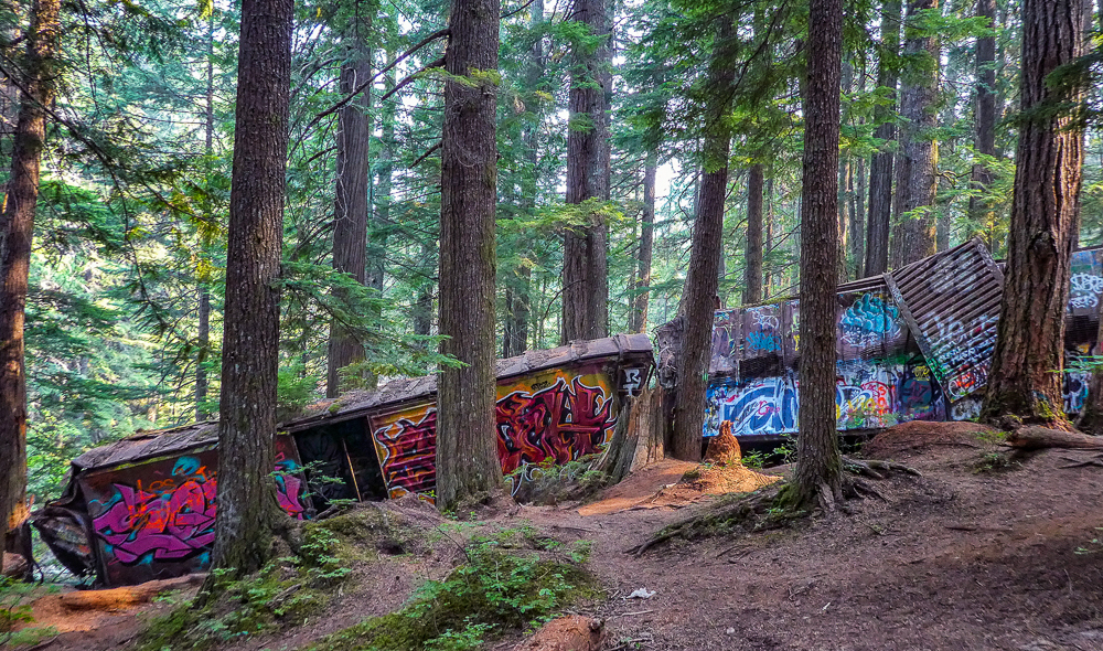 The Train Wreck Trail is one of Whistler’s most unique spots, a handful of mangled, graffiti covered boxcars scattered among towering cedar and fir trees lining the Cheakamus River. The opening of a new bridge spanning the Cheakamus River and connecting the wreck to the Sea to Sky Trail, made it easily accessible from the parking lot near Function Junction. History states that the train derailed in 1956 when a freighter heading south from Liillooet came into an area under track repair just a little to fast, and the fourth engine turned a rail, causing the train wreck. The new bridge is a short 1 km from the trailhead, and once across the bridge you in the middle of the Train Wreck site. The Train Wreck site was not only used by hikers but also mountain bikers made a path through the site over and around many of the wrecked boxcars. The site was also favoured by local graffiti artists, photographers and trail runners.Thus the Whistler Train Wreck is a magical kind of spot you’re unlikely to find anywhere else. After the hike we went into Function Junction and happened upon the Whistler Brewing Company, a great find for a refreshing brew on a hot day. Click on thumbnail to view images