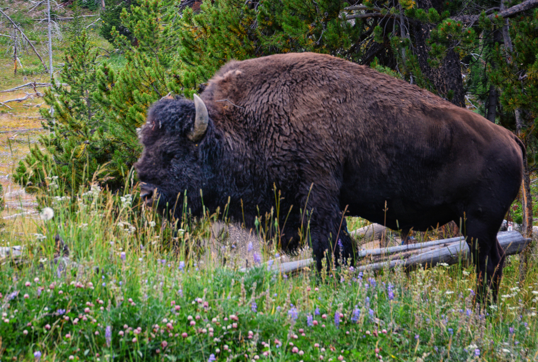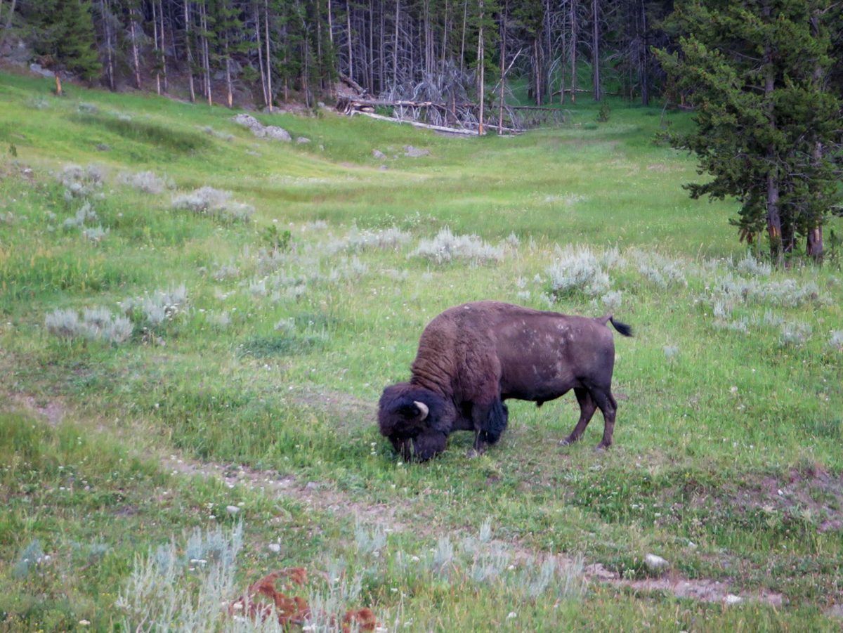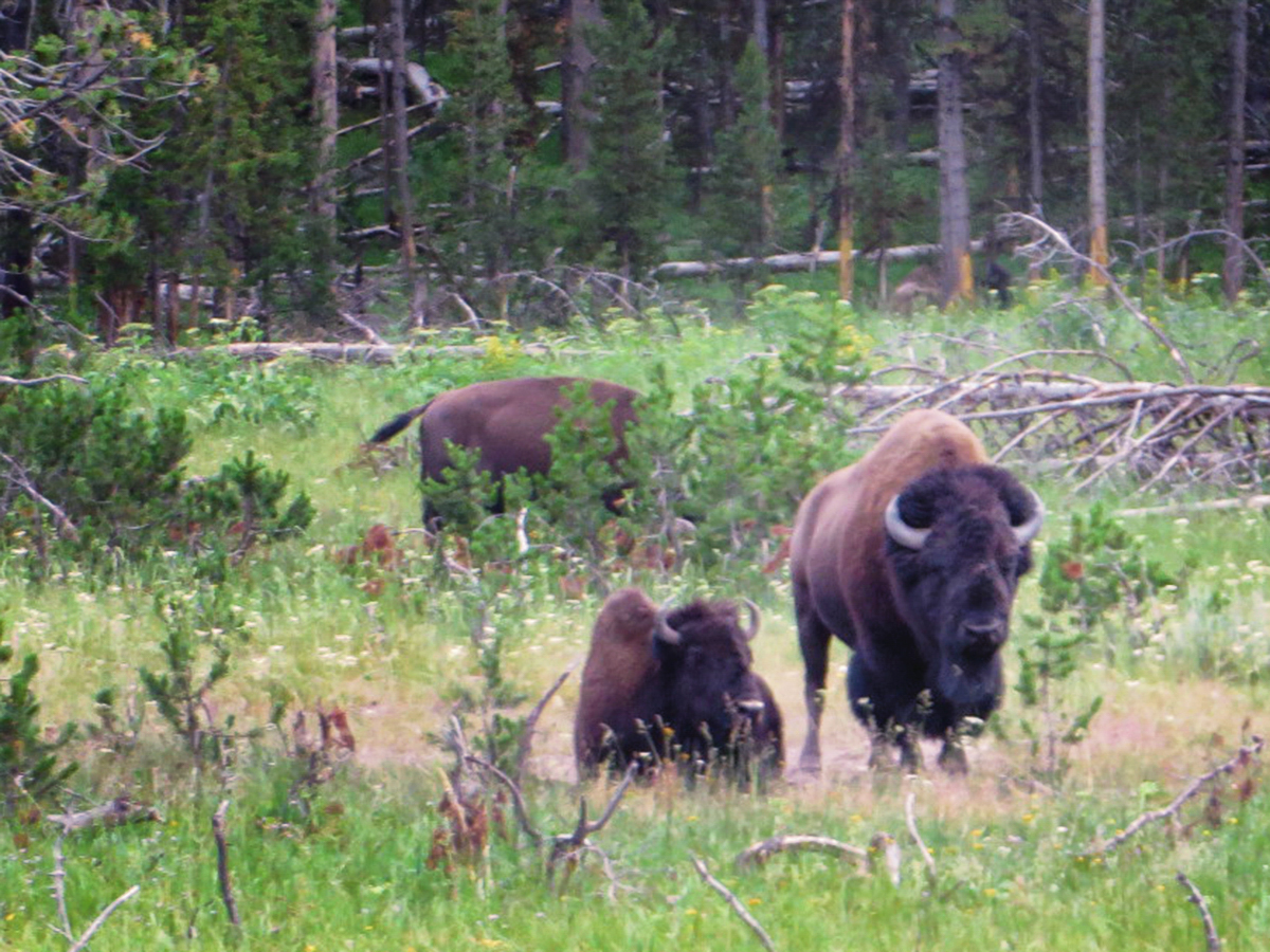 We made our way back to the car and continued along the road to West Thumb, one of the smallest geyser basins in the Park. Because it is located along the shores of Yellowstone Lake, it is the most scenic. We walked along the boardwalk and viewed all the different geysers and hot springs, in multiple colors of blues, greens and yellow. Yellowstone Lake is the largest body of water in the Park and is 7,732 feet above sea level, making it the largest freshwater lake above 7,000 feet in North America. The Lake covers 136 square miles with 110 miles of shoreline. We had great views of the lake as we drove along the west shoreline to the Hayden Valley, which is the best location to see wildlife. We were fortunate today as it was getting near dusk, and we saw a herd buffalo and a grizzly bear along the side of the road. There was a traffic jam of cars stopping to take photos of the bear while the Rangers were trying to keep the traffic flowing. What a fabulous day we had, there is no place on earth like Yellowstone National Park.