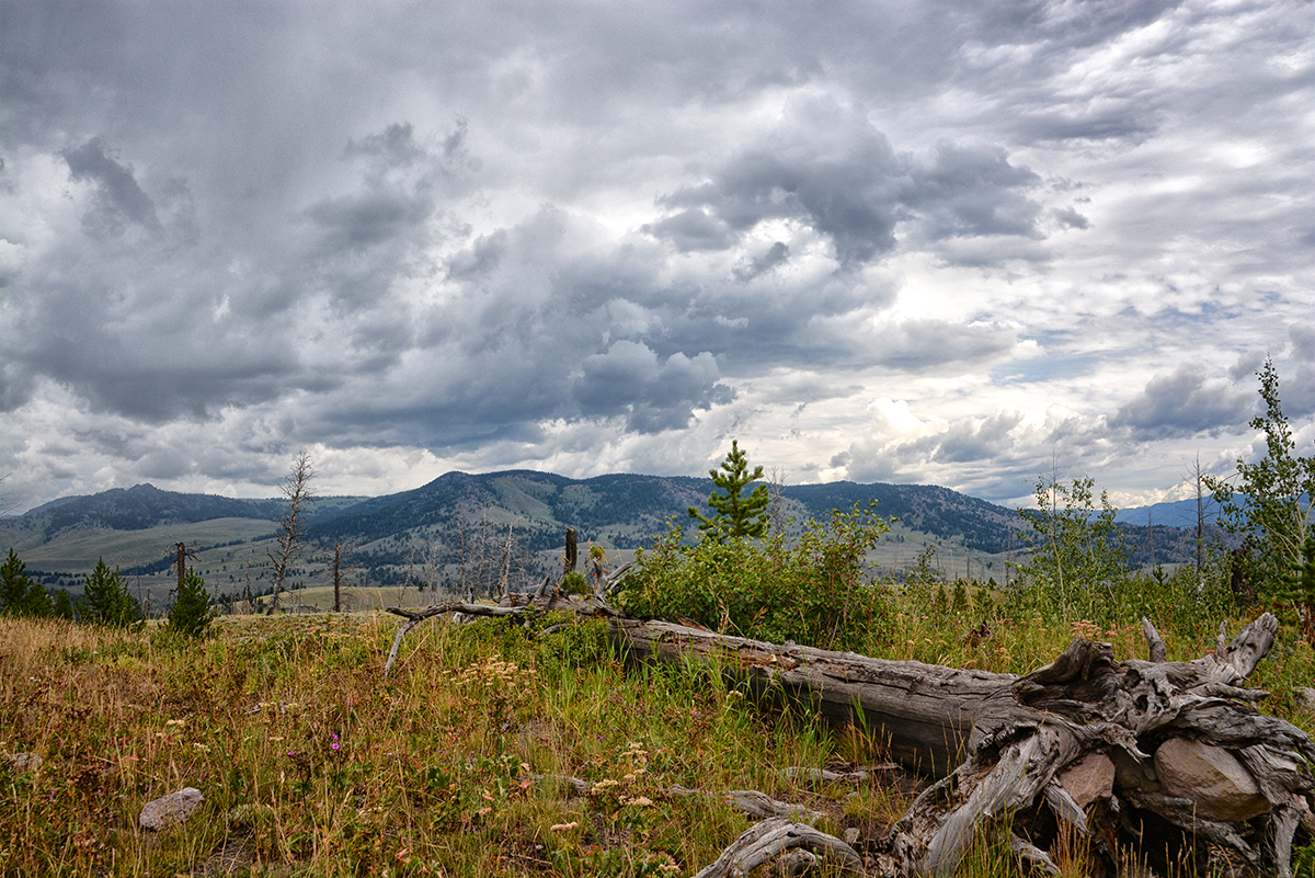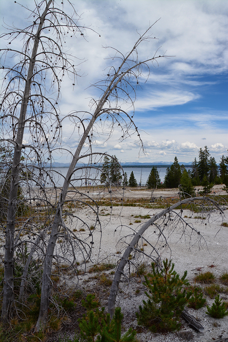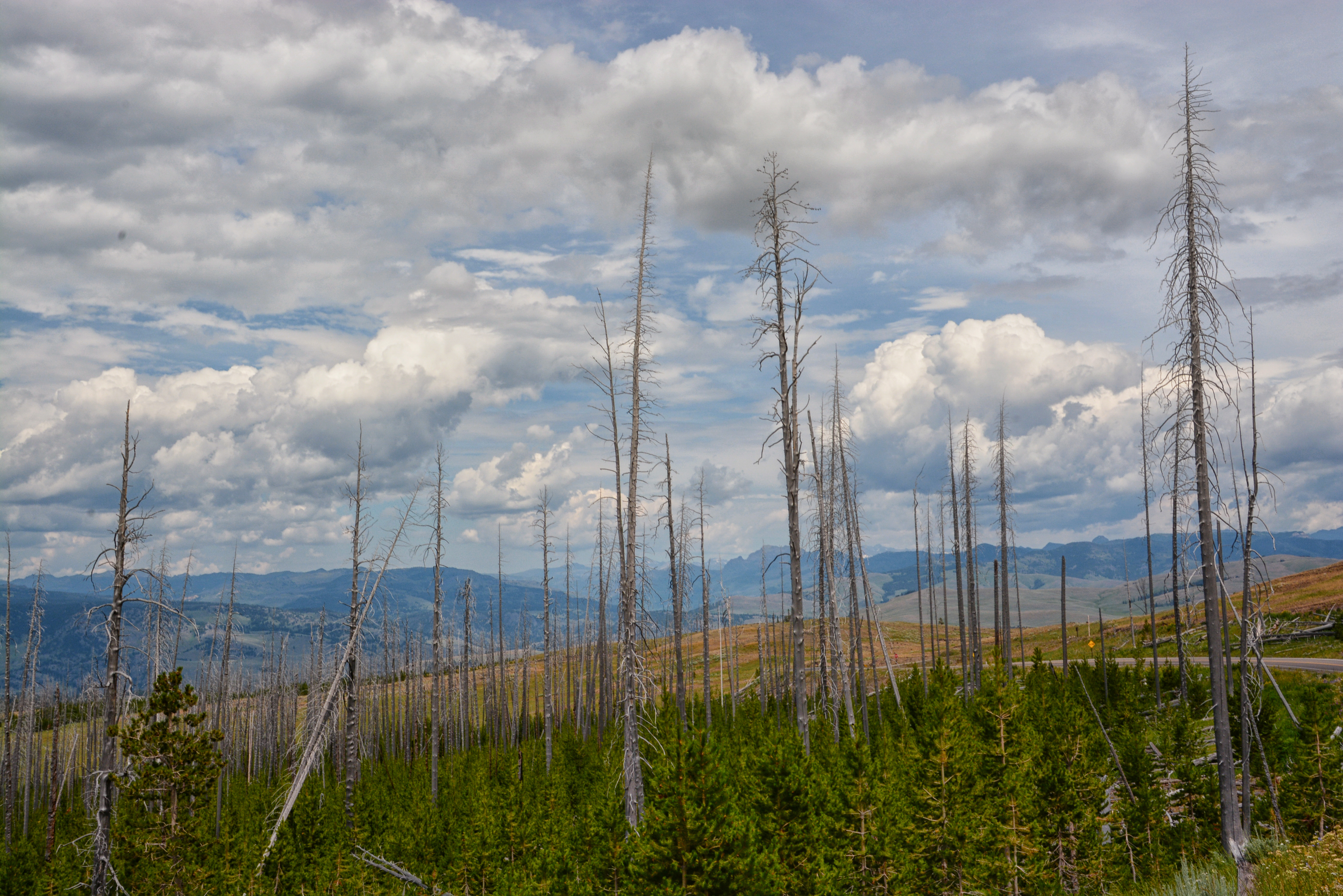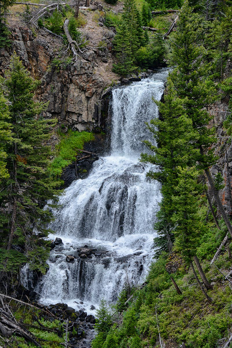 Today we are taking the North Grand Loop where we will view the parks largest and most spectacular waterfalls. Our first stop was the Undine Falls, approximately 60 feet in height descending in three plunges. Lava Creek spills over the cliffs face of a basalt lava flow that was emplaced about 700,000 years ago. Along the winding road we passed the natural destruction from forest fires. It’s been 26 years since the 1988 fires burned more than 30 percent of the park’s vegetation. Now, maturing trees and grasslands flourish in the once-scorched earth. After taking the off road Blacktail Plateau Drive in hopes to see some wildlife,which we didn’t, we stopped at the Petrified Tree, which was created during volcanic activity in Yellowstone National Park. Trees had their organic structure replaced of minerals while they were slowly buried by volcanic ash. The only remaining petrified tree in the area is behind a fence to protect it from vandals. There used to be two other trees here but pieces were removed for souvenirs. We walked up to take a photo of the tree with all the other tourists and then headed back to the main road.