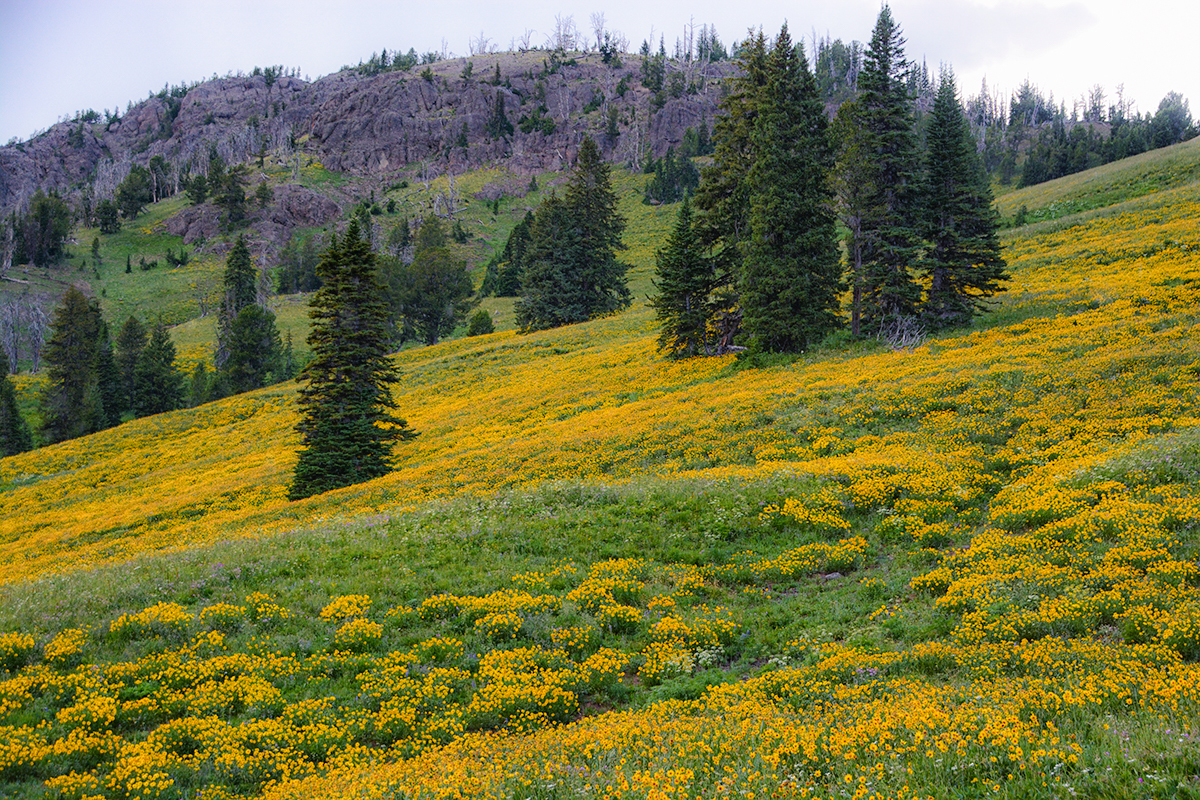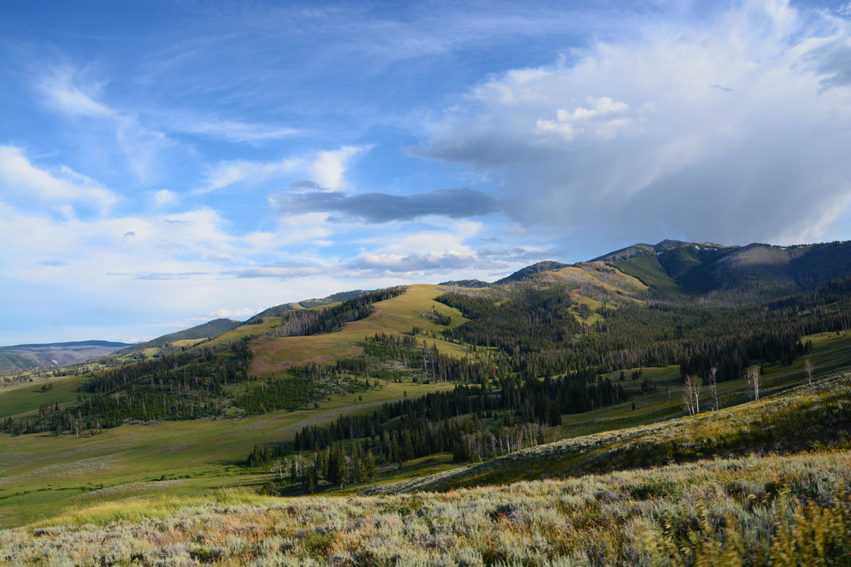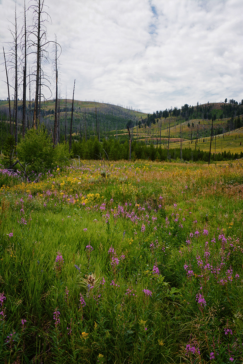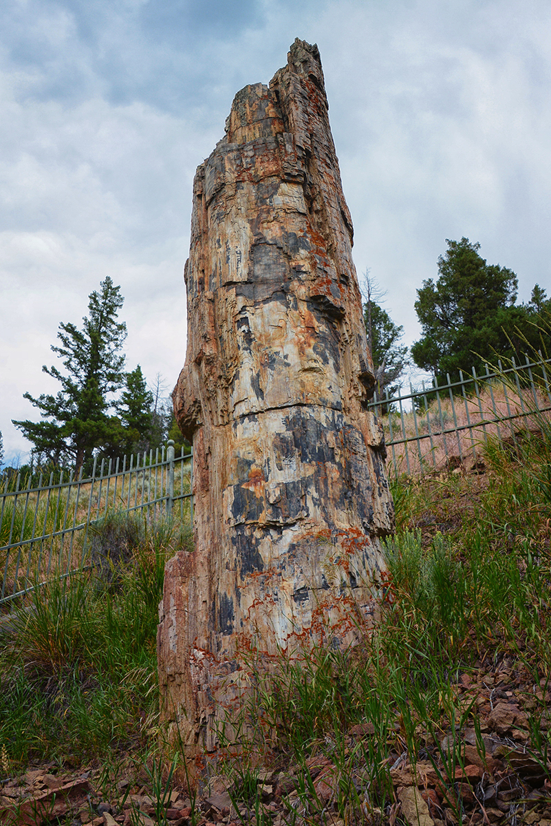 Today we are taking the North Grand Loop where we will view the parks largest and most spectacular waterfalls. Our first stop was the Undine Falls, approximately 60 feet in height descending in three plunges. Lava Creek spills over the cliffs face of a basalt lava flow that was emplaced about 700,000 years ago. Along the winding road we passed the natural destruction from forest fires. It’s been 26 years since the 1988 fires burned more than 30 percent of the park’s vegetation. Now, maturing trees and grasslands flourish in the once-scorched earth. After taking the off road Blacktail Plateau Drive in hopes to see some wildlife,which we didn’t, we stopped at the Petrified Tree, which was created during volcanic activity in Yellowstone National Park. Trees had their organic structure replaced of minerals while they were slowly buried by volcanic ash. The only remaining petrified tree in the area is behind a fence to protect it from vandals. There used to be two other trees here but pieces were removed for souvenirs. We walked up to take a photo of the tree with all the other tourists and then headed back to the main road.