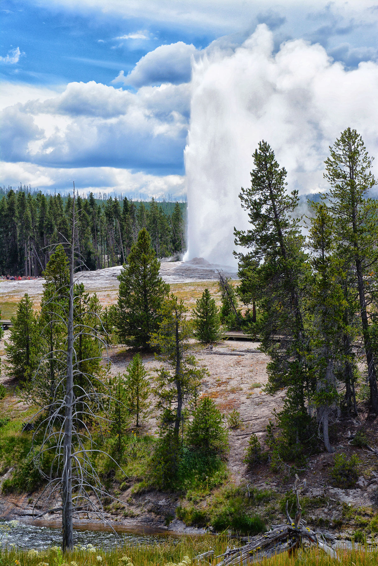 July 30th, we leave Livingston on a beautiful sunny morning and head back through Paradise Valley. Yellowstone National Park has approximately half of the worlds geysers, and most of them are located at the Upper Geyser Basin where we are heading for today, to view some of these hydrothermal wonders. First we drove around the Firehole Lake Drive where we saw the White Dome Geyser, a conspicuous cone-type geyser, and waited about 15 to 20 minutes for it to erupt. The eruption lasted 2-3 minutes and reach heights of about 30 feet. What a thrill it was when it did erupt and we were so close to its spray you could almost feel the mist. Nearby Great Fountain Geyser erupts every 9-15 hours but we didn’t have time to wait to see this eruption. It was on to Old Faithful which was full of tourists waiting for it to erupt. The Park Rangers are able to predict its eruption fairly accurately, it erupts every 35-120 minutes for 1 1/2 to 5 minutes. The time of the next eruption is posted in all the buildings and we had about a half hour before the eruption so we walked along the 1.3 mile boardwalk on Geyser Hill. We saw numerous hot springs with pools of deep blue water, and more than 40 geysers including Beehive and Giantess Geysers. We stayed up on the hill when the eruption occurred away from the crowds and watched the entire eruption which lasted for about 5 minutes and reached heights of 90-184 feet.