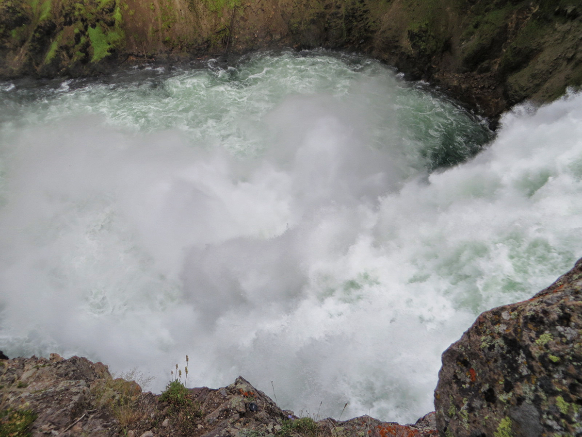 To view these falls we went to the Canyon Village where we took the one-way loop drive that takes you to the brink of the Grand Canyon and offers numerous different viewing areas of the Lower Falls, the biggest and most famous in the Park. We took the trail to the Brink of the Lower Falls, only 3/4 mile round trip, but steep with many switch backs, where we witnessed the flow up close, standing atop the Falls is one of the most breath-taking experiences in the entire park, and this was our first view of the Lower Falls, at 308 feet high, or almost twice as high as Niagara. The volume of water is in no way comparable to Niagara as the width of the Yellowstone River before it goes over the Lower Falls is 70 feet whereas Niagara Falls is a half mile. The Lower Falls of the Yellowstone is still the largest volume major waterfall in the Rocky Mountains of the US. The volume of water flowing over the falls can vary from 63,500 gal/sec at peak runoff to 5,000 gal/sec in the fall. As you can hear the volume of water cascading over the falls in the video from the brink and flowing down into the Grand Canyon of the Yellowstone. From Inspiration Point, the canyon wall juts far out into the canyon, allowing spectacular views both upstream and down, and a panoramic overlook of the Grand Canyon of Yellowstone River, approximately 24 miles long, between 800 and 1,200 feet deep and a mere 3/4 mile wide, with treacherously steep canyon walls painted in oranges, yellows and reds. Those yellow rocks are how the Park got the name “Yellowstone”.