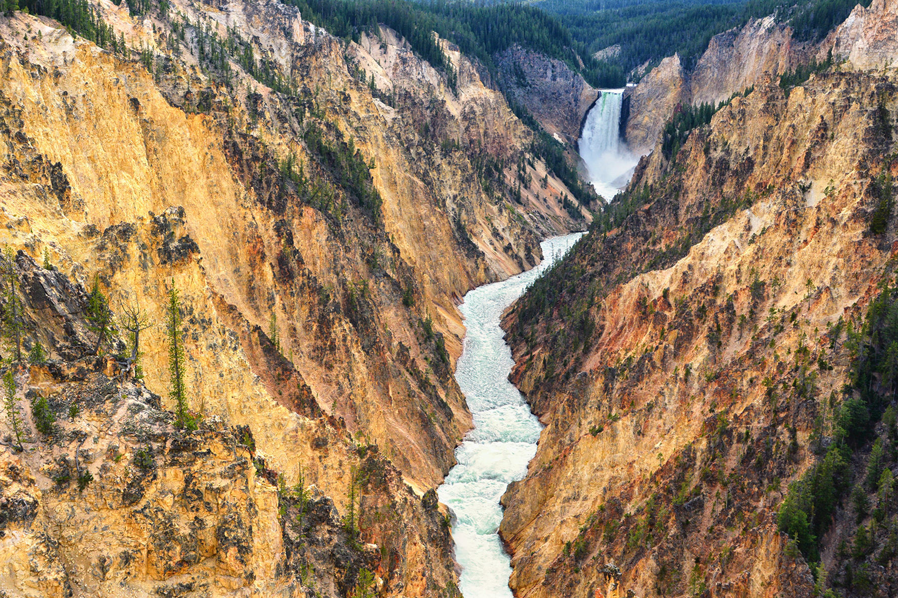 Yellowstone Falls consists of two major waterfalls on the Yellowstone River. As the Yellowstone River flows north from Yellowstone Lake it leaves the Hayden Valley and plunges first over Upper Falls and then a quarter mile downstream over the Lower Falls at which point it enters the Grand Canyon of the Yellowstone River up to 1000 feet deep. The Yellowstone is the longest free flowing river in the lower 48 states.