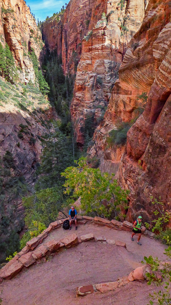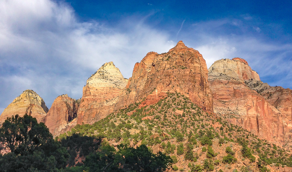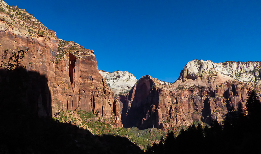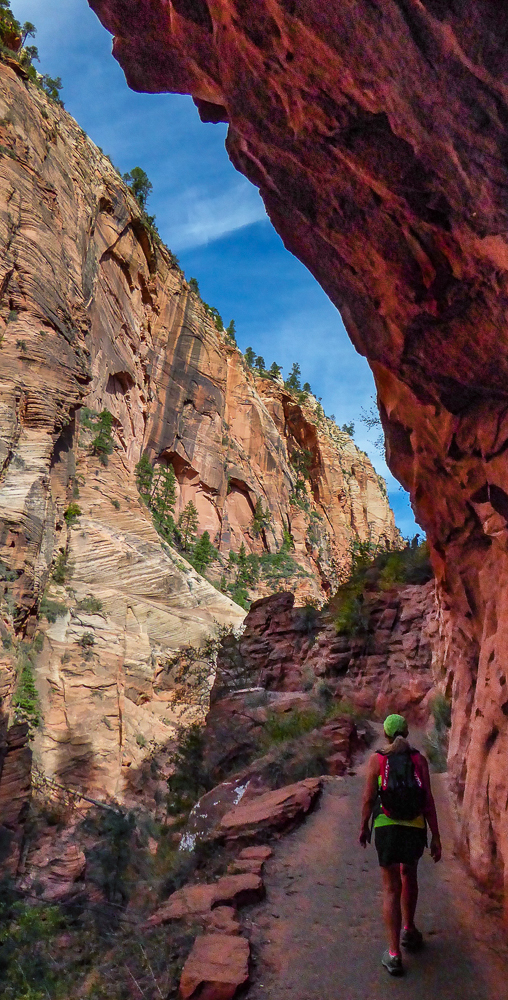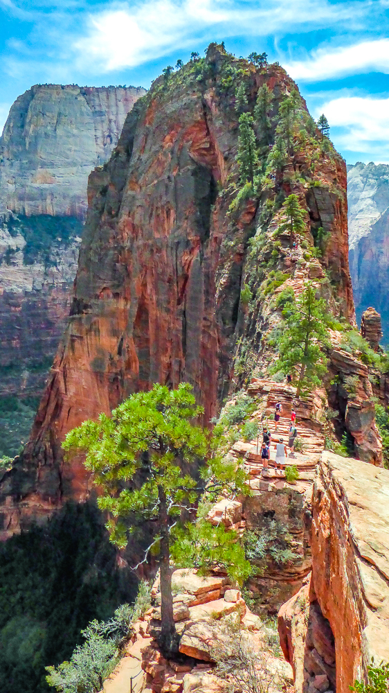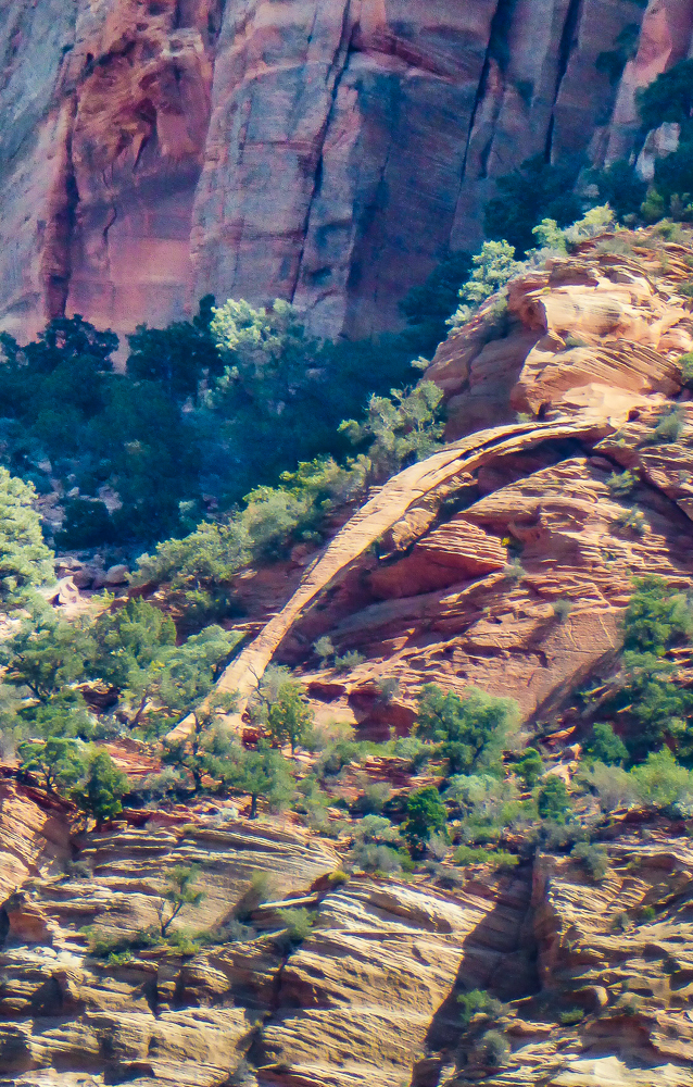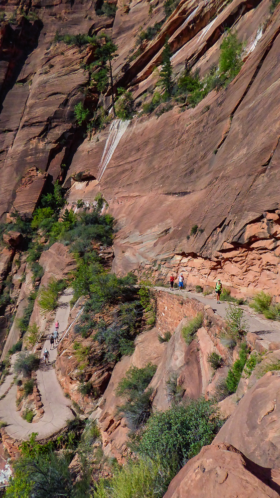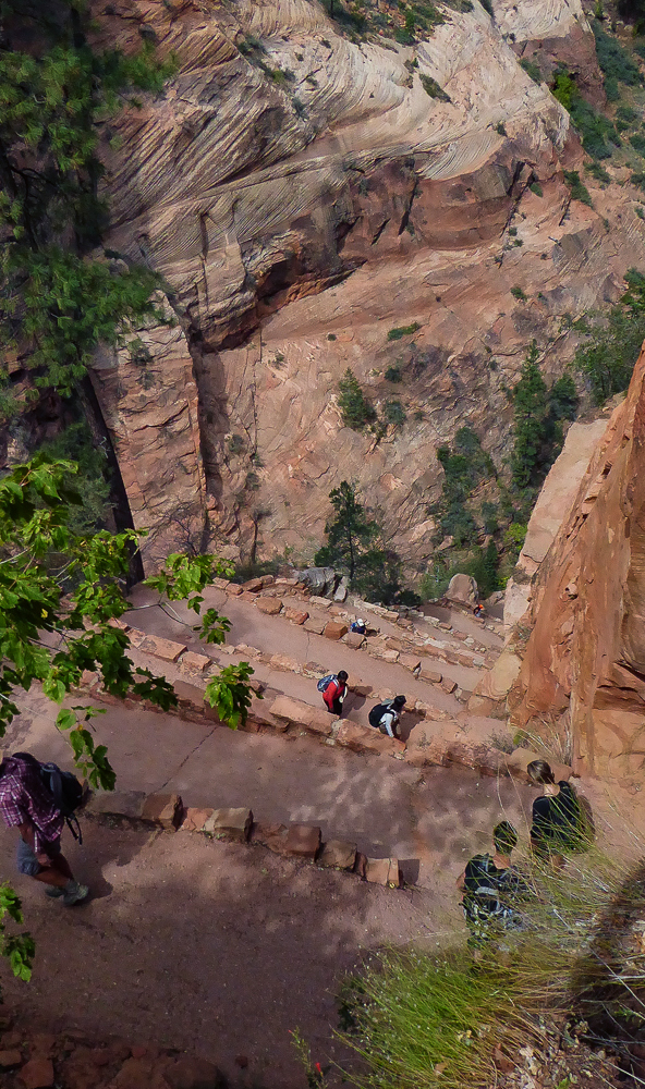 Our first hike we chose to do was Angels Landing, not for the faint hearted, more for the die harded. This is one of the most famous hikes in all of Zion National Park, and it is very challenging but worth the view. We took the shuttle to the Grotto Picnic area and crossed the river and started the hiked on a well maintained level trail to switchbacks that led us up to Refrigerator Canyon. Then on up to Walter’s Wiggles, a series of tight switchbacks onto the ridge at Scouts Lookout. A lot of people stop here and don’t experience the best part of the hike, the ridiculously steep and narrow Hogsback, using chains bolted into the stone to keep hikers from sliding over the edge of the cliff. If you get vertigo or are afraid of heights this hike may not be for you. Once we conquered the Hogsback we arrived at Angels Landing Summit, with views in all directions and particularly the view of Zion Canyon. We stayed here and ate lunch amongst the trees taking in the vistas before heading back down. Click on thumbnail to view images