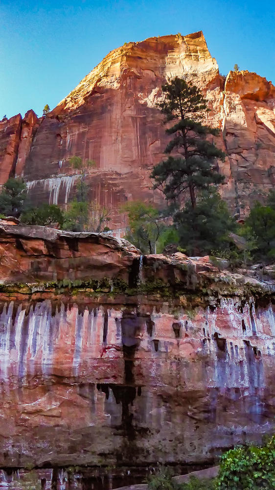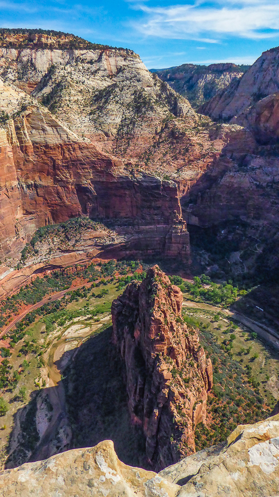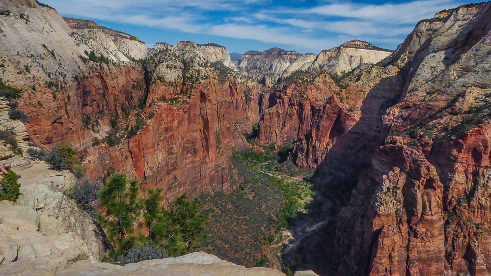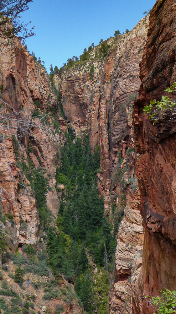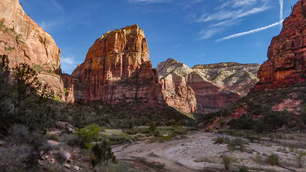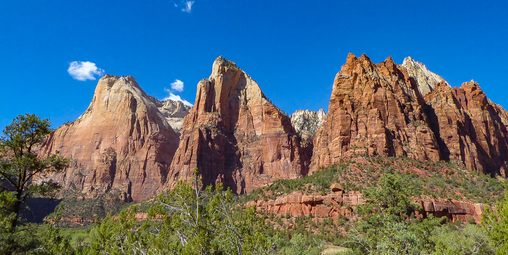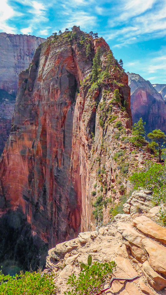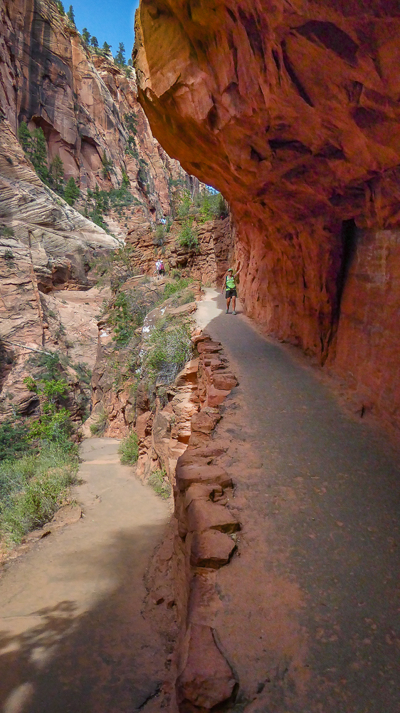 Our first hike we chose to do was Angels Landing, not for the faint hearted, more for the die harded. This is one of the most famous hikes in all of Zion National Park, and it is very challenging but worth the view. We took the shuttle to the Grotto Picnic area and crossed the river and started the hiked on a well maintained level trail to switchbacks that led us up to Refrigerator Canyon. Then on up to Walter’s Wiggles, a series of tight switchbacks onto the ridge at Scouts Lookout. A lot of people stop here and don’t experience the best part of the hike, the ridiculously steep and narrow Hogsback, using chains bolted into the stone to keep hikers from sliding over the edge of the cliff. If you get vertigo or are afraid of heights this hike may not be for you. Once we conquered the Hogsback we arrived at Angels Landing Summit, with views in all directions and particularly the view of Zion Canyon. We stayed here and ate lunch amongst the trees taking in the vistas before heading back down. Click on thumbnail to view images